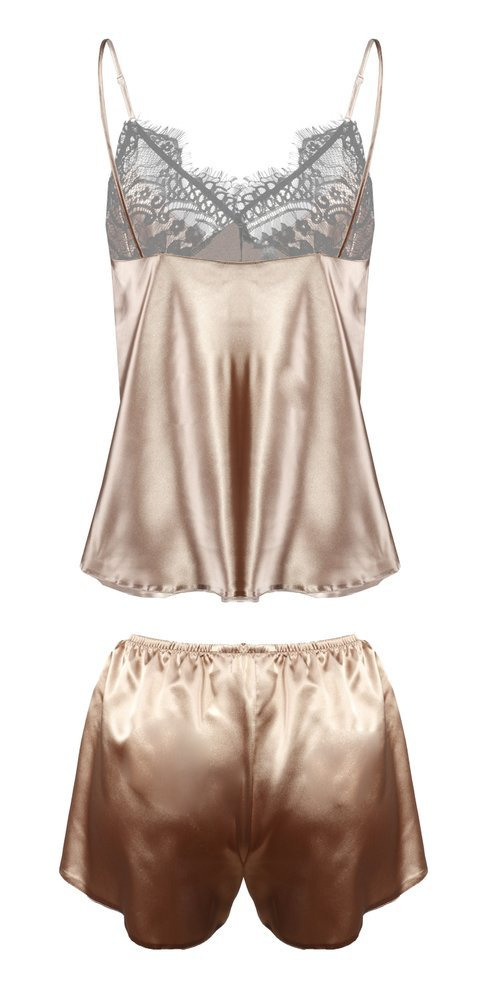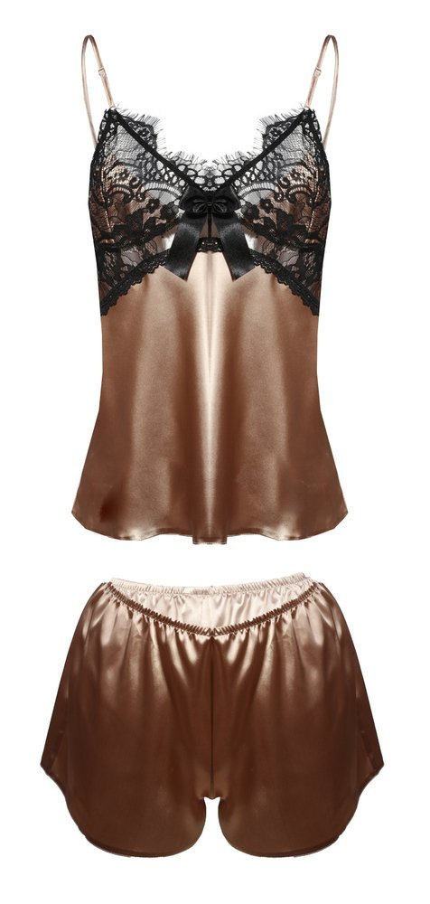 Uwodzicielski komplecik satynowy składający się z dwóch części. Góra koszulki jest uszyta z przepięknej koronki. Miseczki są podszyte satyną która kryje kobiece atuty. Dół i tył koszulki wykończony satyną. Spodenki uszyte z delikatnej satyny. Ramiączka cienkie regulowane.