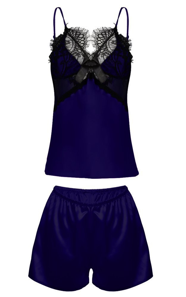 Uwodzicielski komplecik satynowy składający się z dwóch części. Góra koszulki jest uszyta z przepięknej koronki. Miseczki są podszyte satyną która kryje kobiece atuty. Dół i tył koszulki wykończony satyną. Spodenki uszyte z delikatnej satyny. Ramiączka cienkie regulowane.