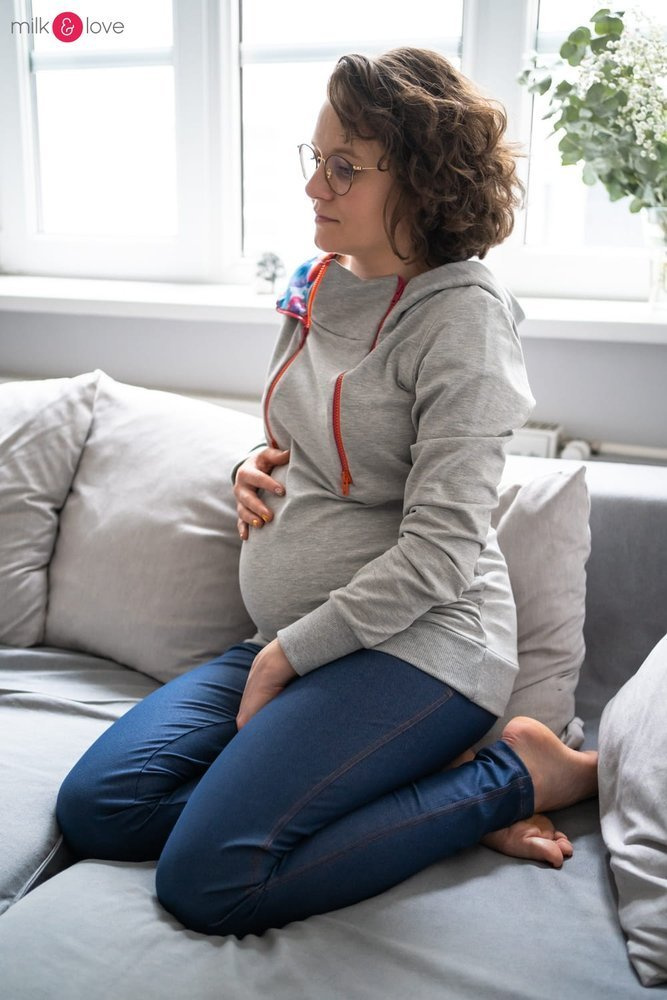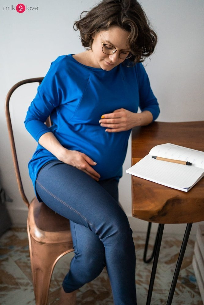 Długie tregginsy ciążowe to idealna baza do wielu stylizacji. Będą równie dobrze wyglądać ze sportową bluzą ciążową i trampkami na co dzień. Wykonane z dzianiny imitującej jeans, która w przeciwieństwie do niego, jest supermiękka i elastyczna - dużo bardziej odpowiednia dla kobiet w ciąży. Tregginsy nie powodują ucisku w okolicy miednicy, gdzie znajdują się naczynia krwionośne doprowadzające krew do łożyska.