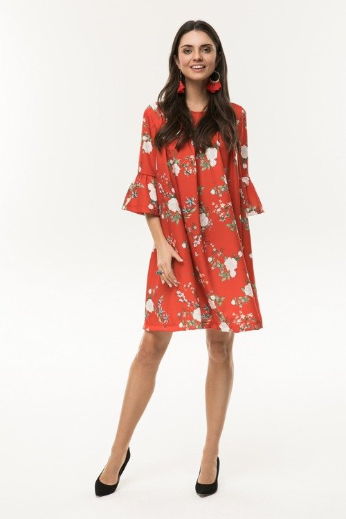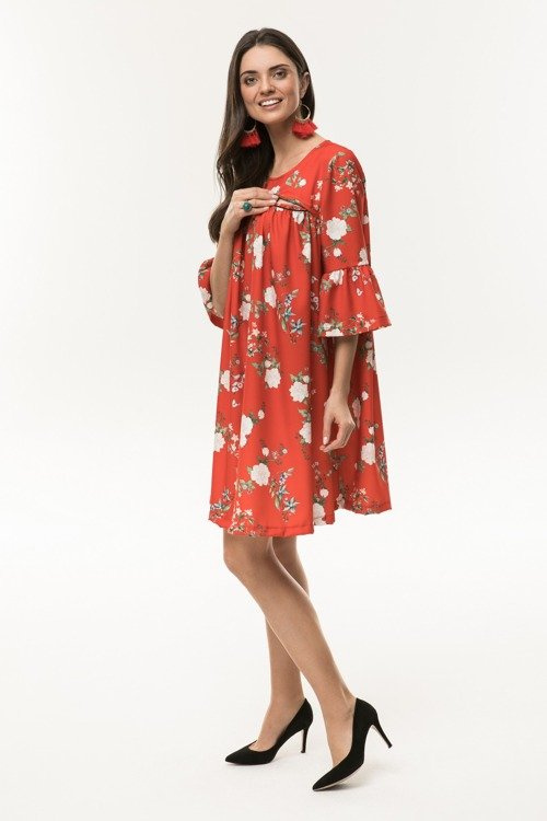 Letnia, zwiewna sukienka,która doskonale wpisuje się w najnowsze trendy. Ozdobna falbanka przy rękawach dodaje uroku. Rozkloszowany krój sprawia, że sukienka dostosowuje się do rosnącego brzuszka. Przewiewny oraz bardzo delikatny,  materiał oraz niedrapiące szwy gwarantują komfort użytkowania.