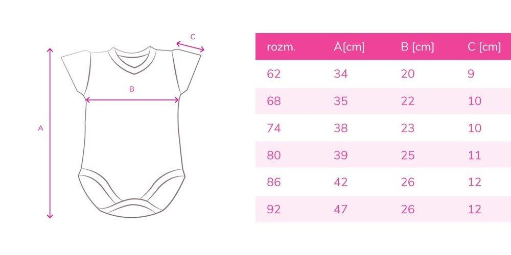 Oryginalne różowe body ozdobione nadrukiem o kwiatowym motywie. Ubranko rozpinane jest na lewym ramiączku oraz w kroczku za pomocą bezniklowych nap, przy szyjce wykończone miękką lamówką.