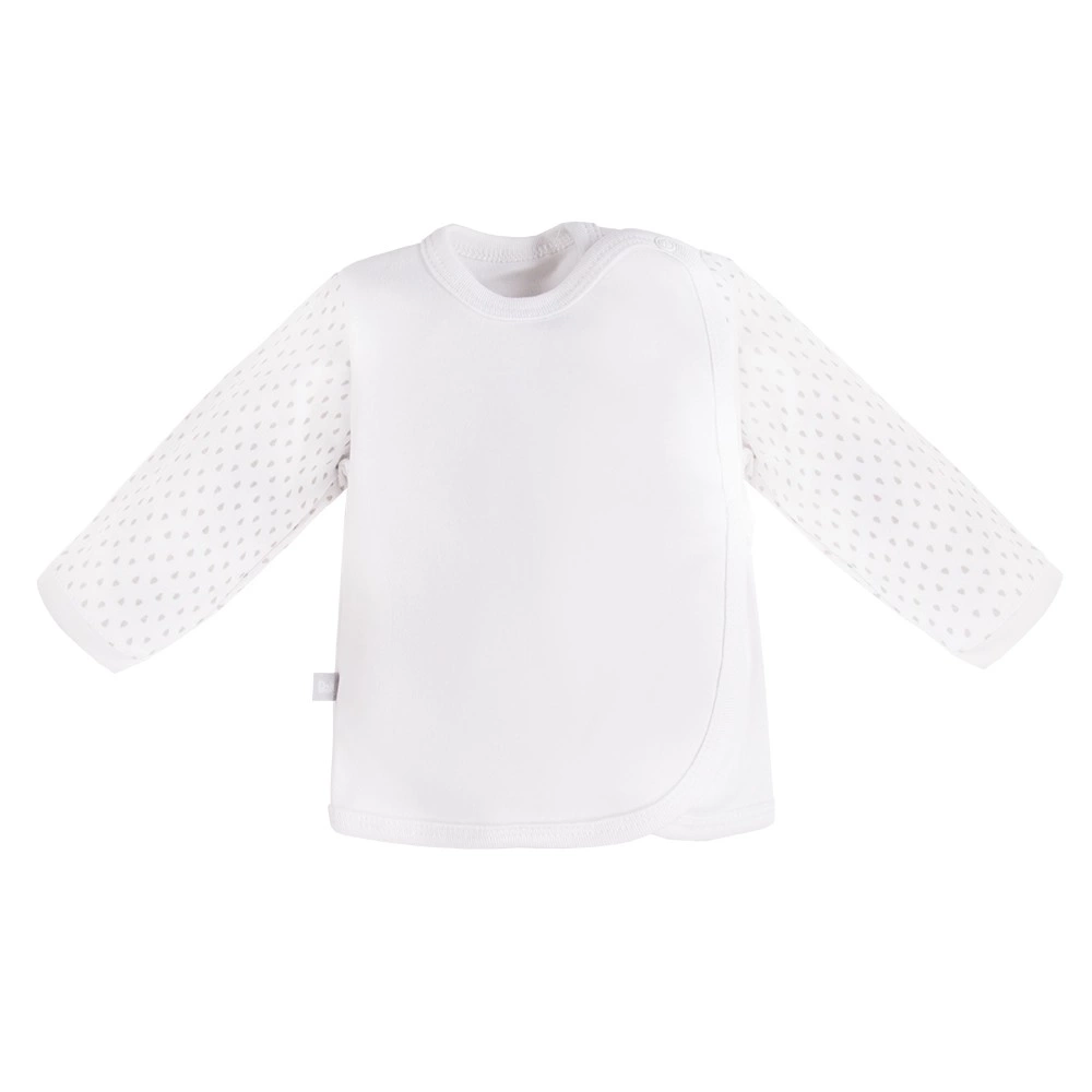 Koszulka z kolekcji "Newborn" w pięciu wersjach kolorystycznych uszyta z miękkiej i przyjemnej w dotyku dzianiny, przełamanej drukami. Krój umożliwia całkowite rozpięcie, przez co ubranko jest funkcjonalne i wygodne. Idealne w pierwszych miesiącach życia maluszka. Wykończone miękką lamówką. Rękawki zakończone są mankietami. Napki nie zawierają niklu. Posiada certyfikat "Bezpieczny dla dziecka". 100% bawełna.