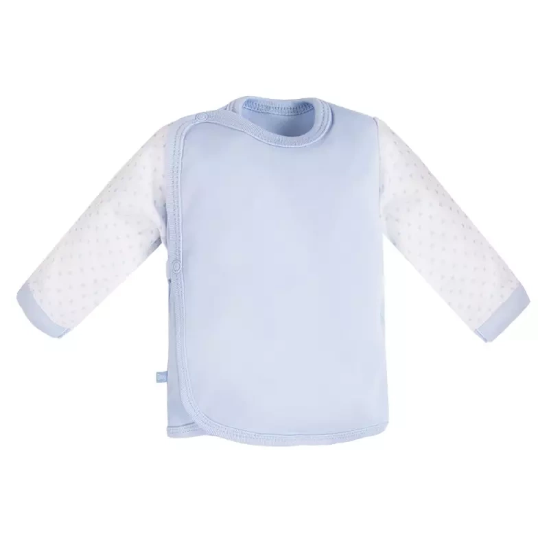 Koszulka z kolekcji "Newborn" w pięciu wersjach kolorystycznych uszyta z miękkiej i przyjemnej w dotyku dzianiny, przełamanej drukami. Krój umożliwia całkowite rozpięcie, przez co ubranko jest funkcjonalne i wygodne. Idealne w pierwszych miesiącach życia maluszka. Wykończone miękką lamówką. Rękawki zakończone są mankietami. Napki nie zawierają niklu. Posiada certyfikat "Bezpieczny dla dziecka". 100% bawełna.