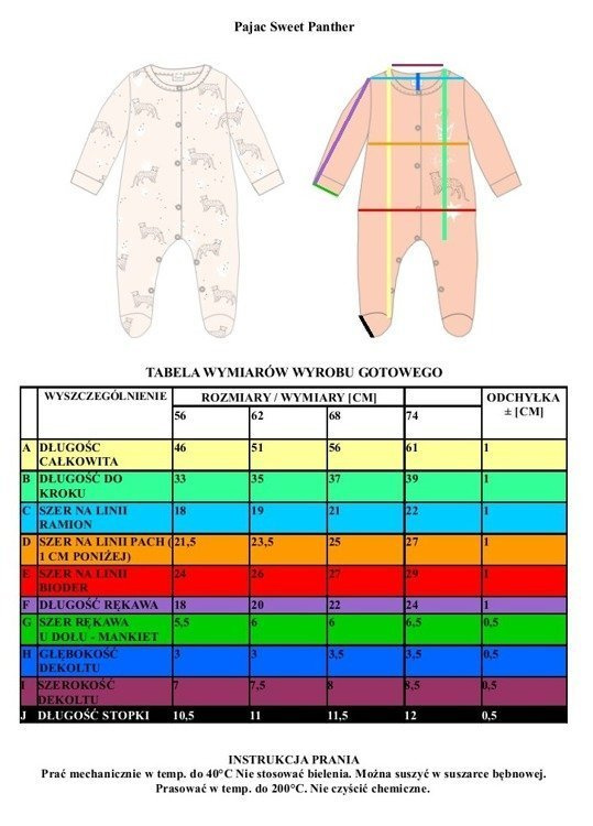 Bawełniany pajac w trzech wariantach kolorystycznych z motywem zwierzątek. Możliwość całkowitego rozpięcia umożliwia łatwe i szybkie ubieranie dziecka. Dodatkowy klin w kroku i stopery nad pietami zapewniają swobodę użytkowania i nie krepują ruchów dziecka.