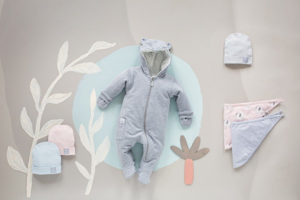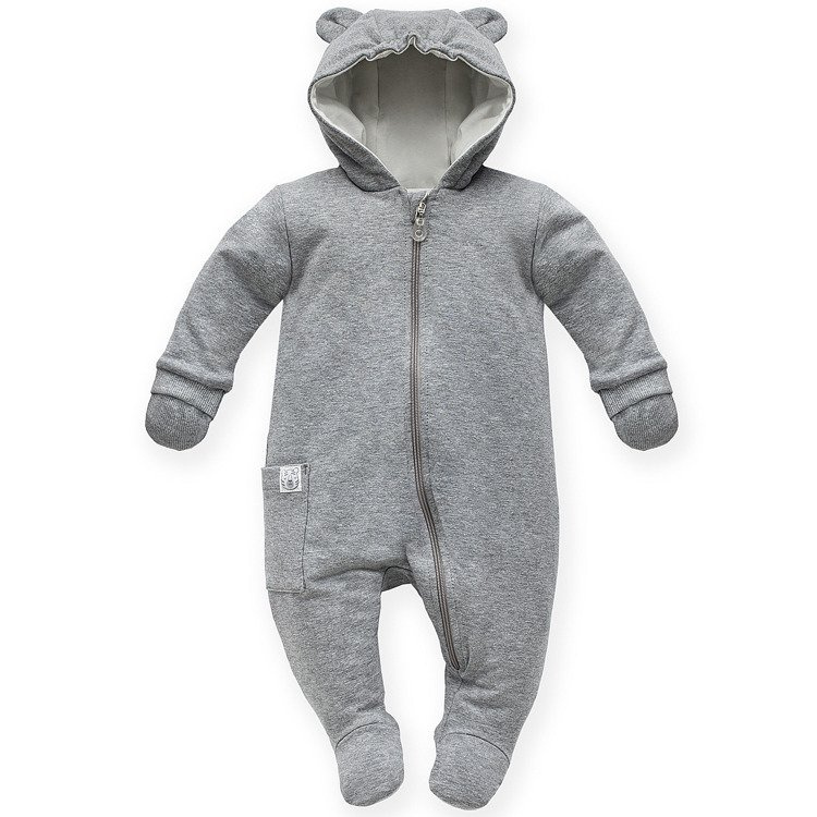 Ocieplany, szary kombinezon idealny na wiosenny spacer. Z uszkami.