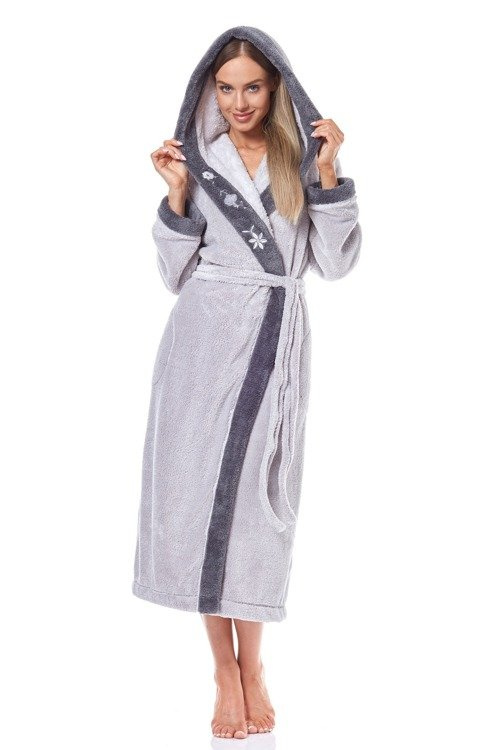 Uroczy oraz  bardzo miękki szlafrok damski wykonany, z miękkiej dzianiny z kapturem. Rękawy oraz krawędzie ozdobione kontrastującą lamówką. Na wysokości klatki piersiowej delikatny, kwiatowy haft.  Wiązany w pasie, po bokach kieszenie.
