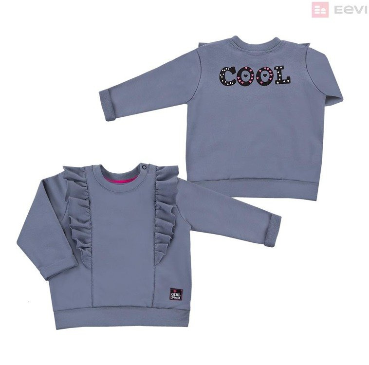 Bluza dziewczęca z kolekcji "POWER" z falbankami. Uszyta z miękkiej i przyjemnej w dotyku dzianiny dresowej. Rękawki zakończone ozdobnym wywinięciem.