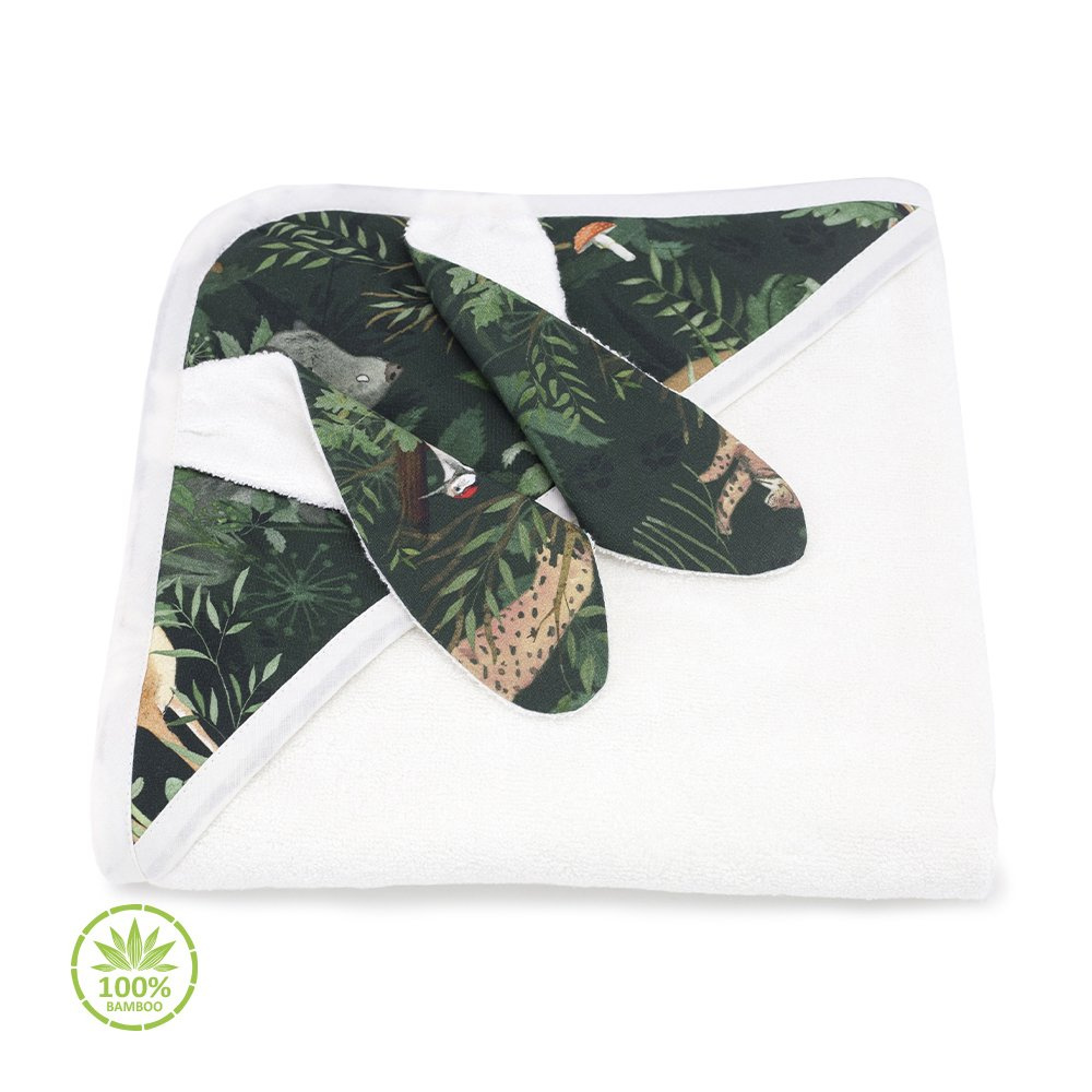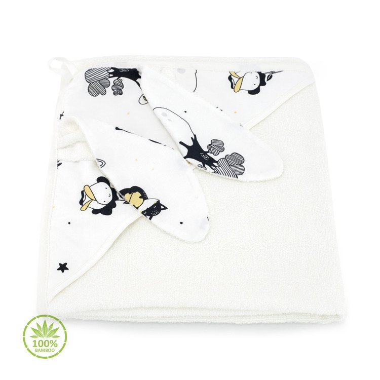 Sprawdzi się również na basenie, czy na plaży, otuli i ogrzeje delikatną skórę dziecka. Posiada praktyczny kapturek ze wzorem kolekcji, na kapturku przesłodkie uszka, a cały jest obszyty elegancką lamówką. W górnym rogu ręczniczek ma troczek ułatwiający zawieszenie.