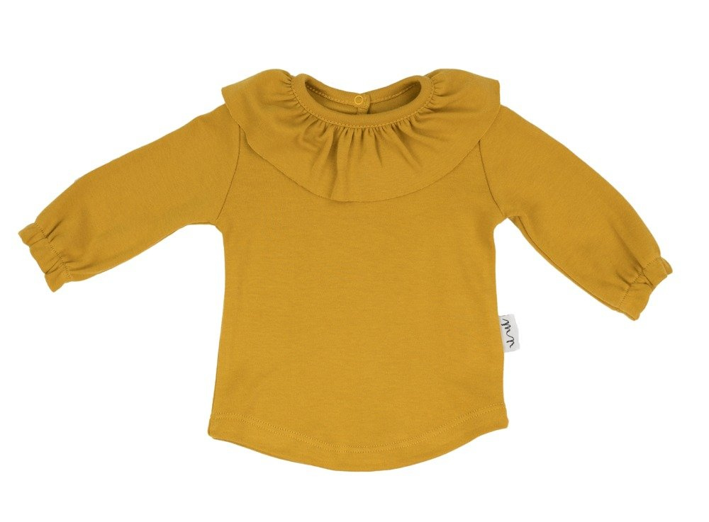 Musztardowa bluzeczka z długim rękawem, wykończona falbanką pod szyją, rękawy zakończone ściągaczem. Ubranko posiada praktyczne napy na plecach ułatwiające ubieranie. Uszyte ze 100% bawełny organicznej, posiadającej certyfikat Oeko-Tex Standard 100 Tekstylia godne zaufania.
