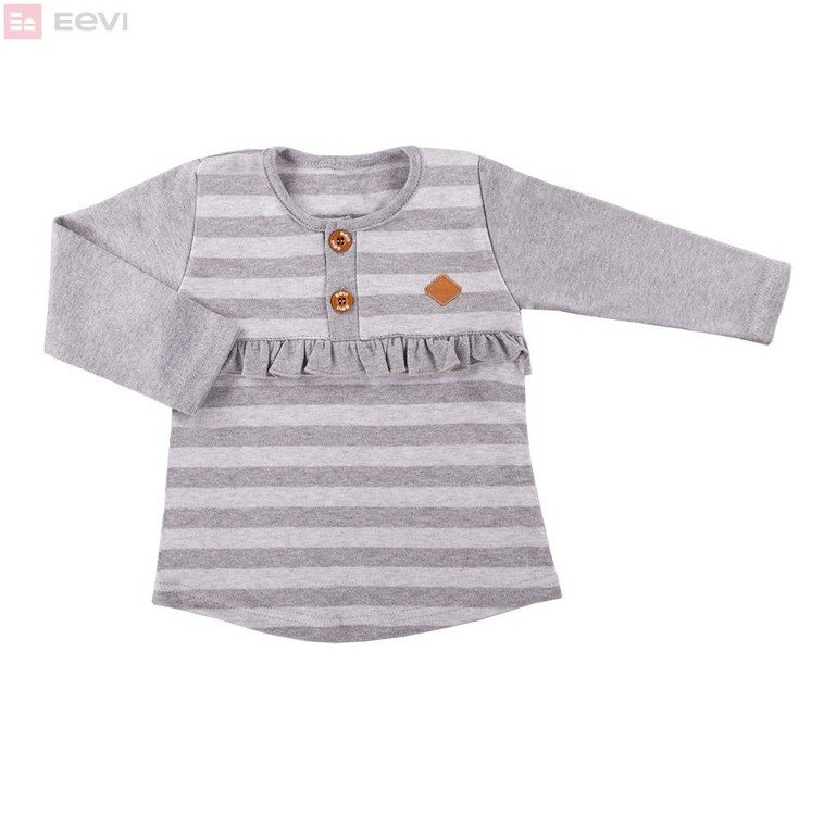 Bluzka z kolekcji "Trip" uszyta z miękkiej i przyjemnej w dotyku dzianiny bawełnianej. Bluzka w paseczki zapinana na guziczki. Elementem ozdobnym jest urocza falbanka oraz wszywka. Mamy chętnie wybierają bluzeczki zamiast bodów dla większych dzieciaczków szykujących się do przedszkola.
