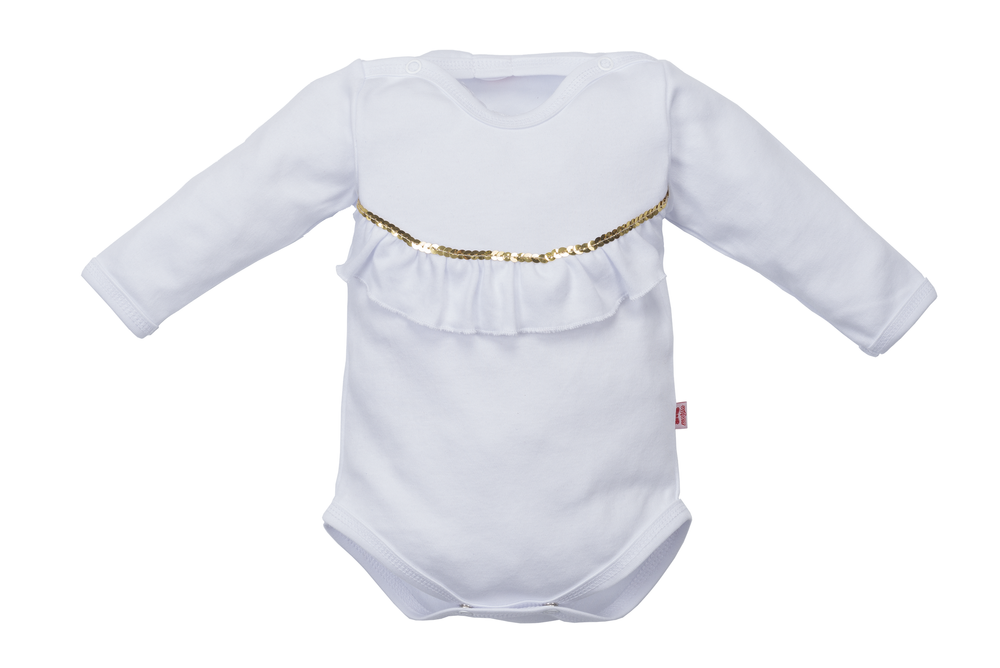 Niezwykle praktyczne i wygodne body z kolekcji Santa. Wykonane z mięciutkiej bawełny, ozdobione falbanką. Zapinane na bezniklowe napki.