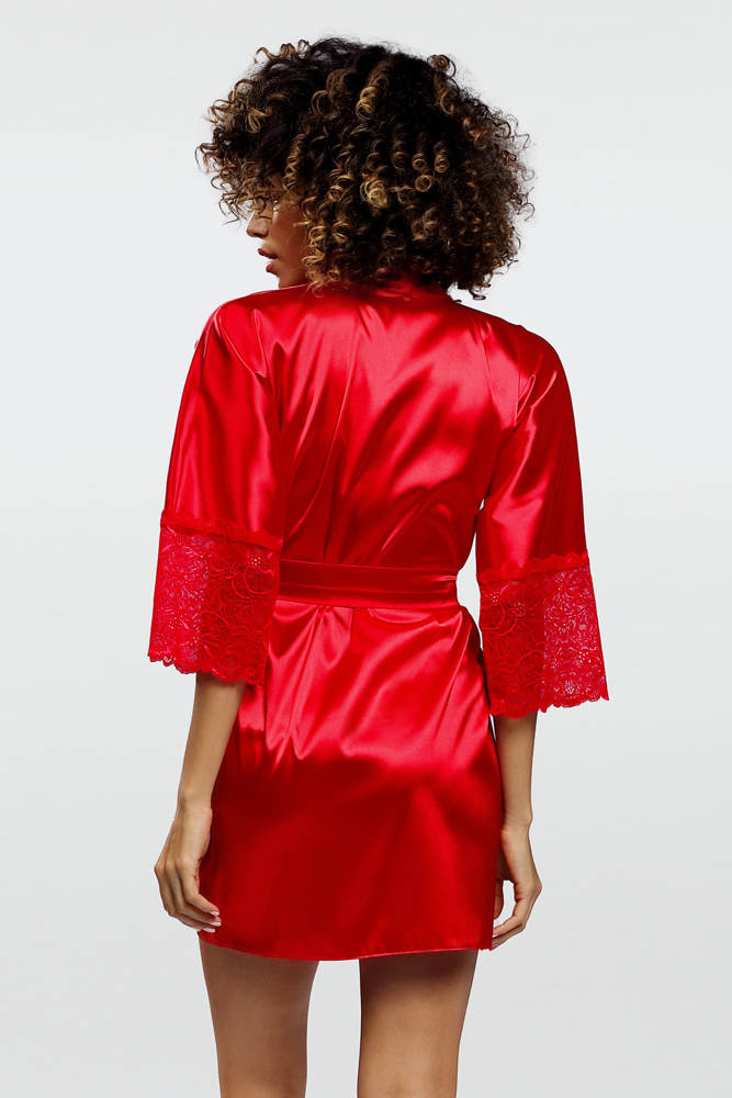 Kusząca, a zarazem elegancka satynowa podomka, która powinna się znaleźć w garderobie każdej kobiety. Rękawy wykończone szeroką koronką, co dodaje lekkości i kobiecości. Szlafrok zalotnie wiązany w pasie. Skład: 100% poliester.