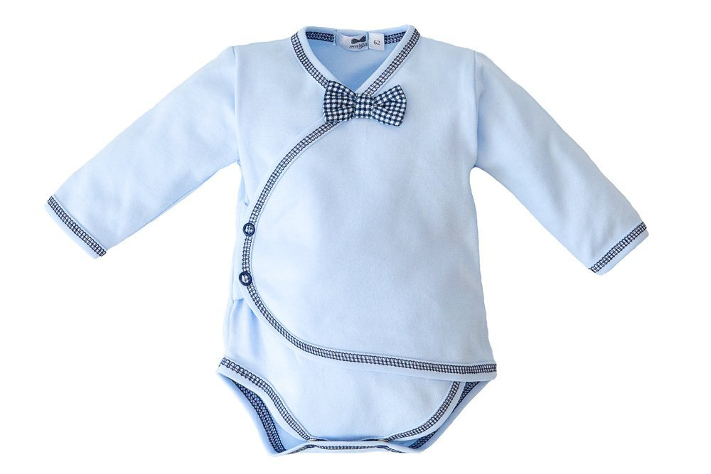 Body kimono w delikatnym, błękitnym kolorze wykończone kontrastującą granatową nitką. Zapinane na antyalergiczne napki. Eleganckiego charakteru dodaje muszka w pepitkę. Jest ona przyszyta do ubranka na stałe.