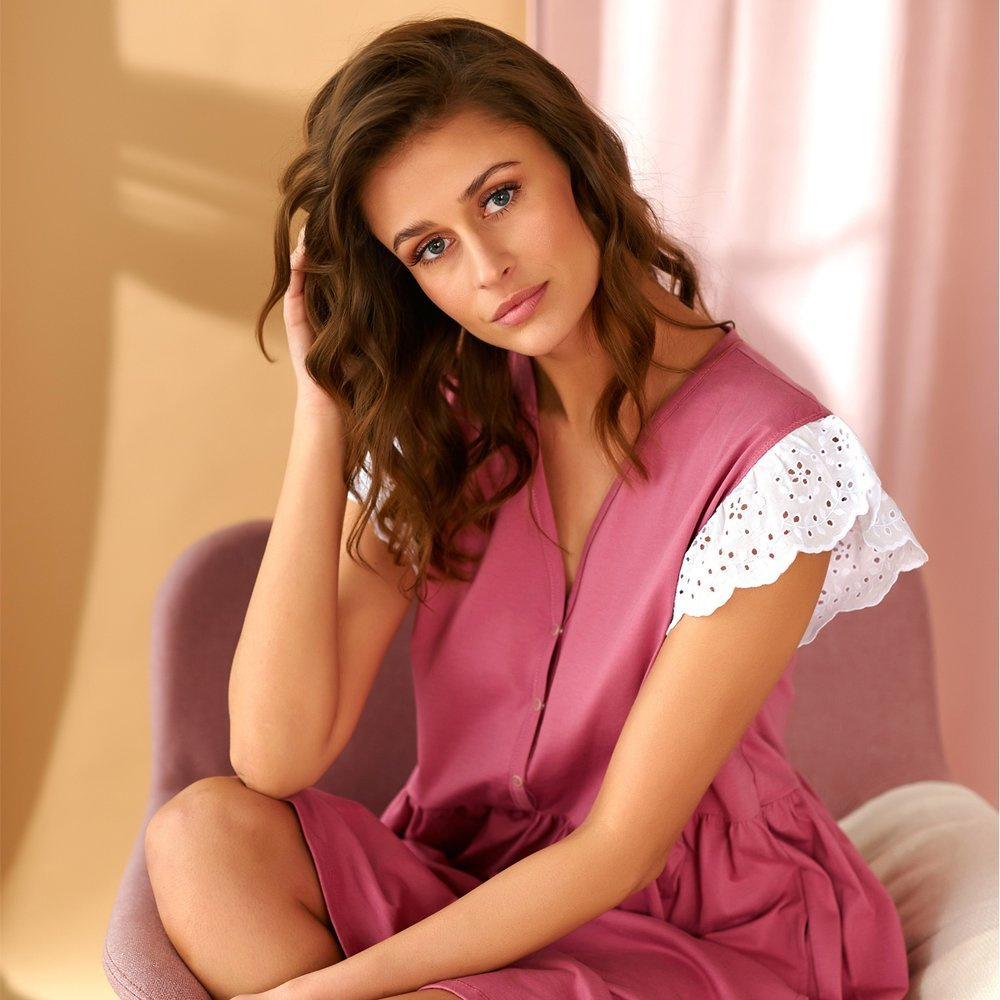 Kobiety w ciąży i karmiące mamy mają wyjątkowe potrzeby, także te dotyczące bielizny. Ważne by w tym szczególnym okresie życia czuły się nie tylko komfortowo, lecz także atrakcyjnie. Niezwykle komfortowa i przy tym urocza koszula nocna. Model z krótkim rękawem, ozdobiony uroczą falbanką. Dekolt okrągły z wygodnym zapięciem na napy. Dół rozkloszowany. Koszula wykonana jest z wysokiej jakości, przyjemnej w dotyku bawełniany organicznej. Doskonale sprawdzi się w ciąży, a także przy karmieniu maleństwa.