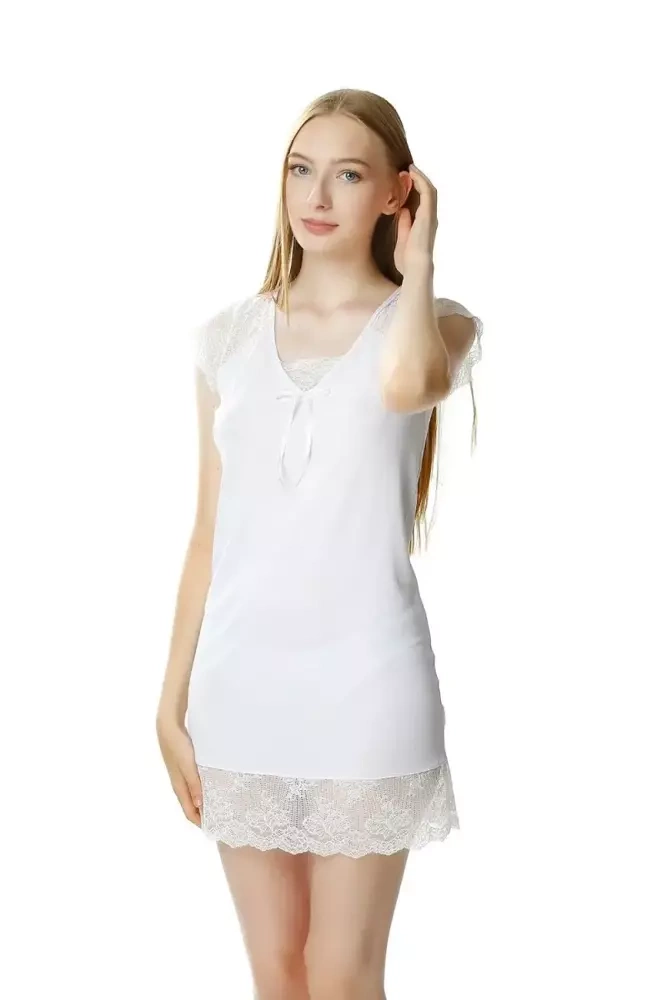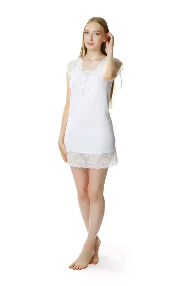 Miękka, miła w dotyku wiskoza i delikatna koronka sprawiają, że prezentowana koszula nocna z krótkim rękawem jest niezastąpionym elementem kobiecej, nocnej garderoby. Wygodny, lekko dopasowany krój, atrakcyjny kształt dekoltu. Krótkie rękawy wykonane z koronki, dół obszyty koronką.