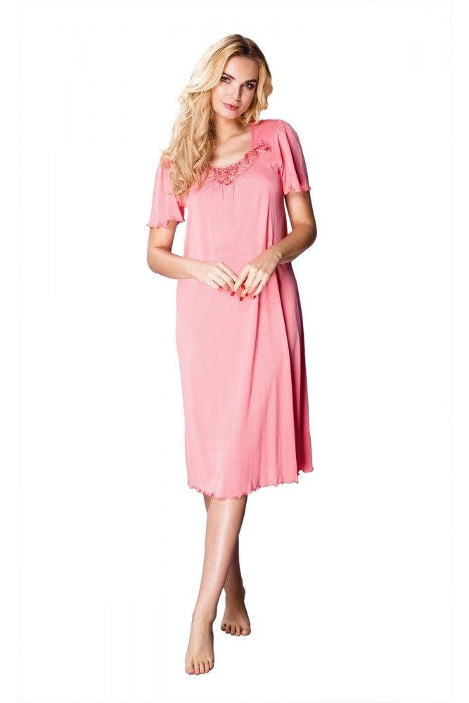 Koszula nocna wykonana z niezwykle funkcjonalnej dzianiny wiskozowej - z krótkim rękawem, o długości delikatnie za kolano. Motywem zdobniczym jest efektowna aplikacja przy dekolcie. Wykonana z pięknej koronki gipiurowej, dodającej jej powabu. Dół koszuli oraz rękawy wykończone ozdobnym szwem formującym się w lekką falbankę.