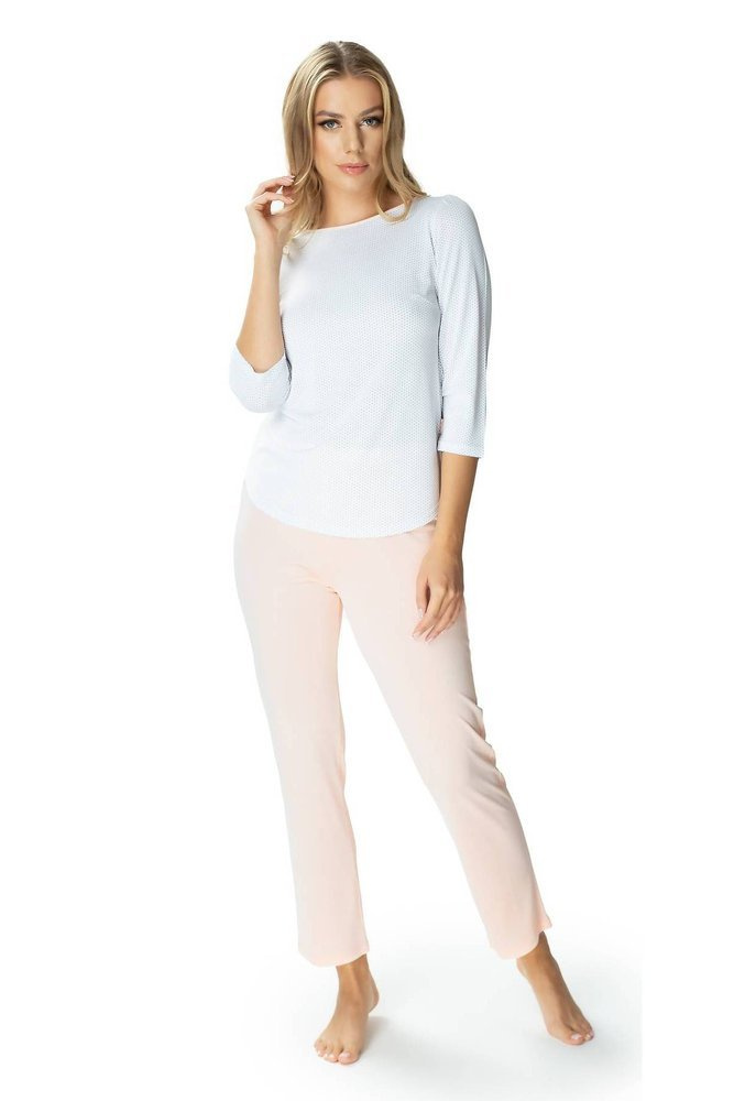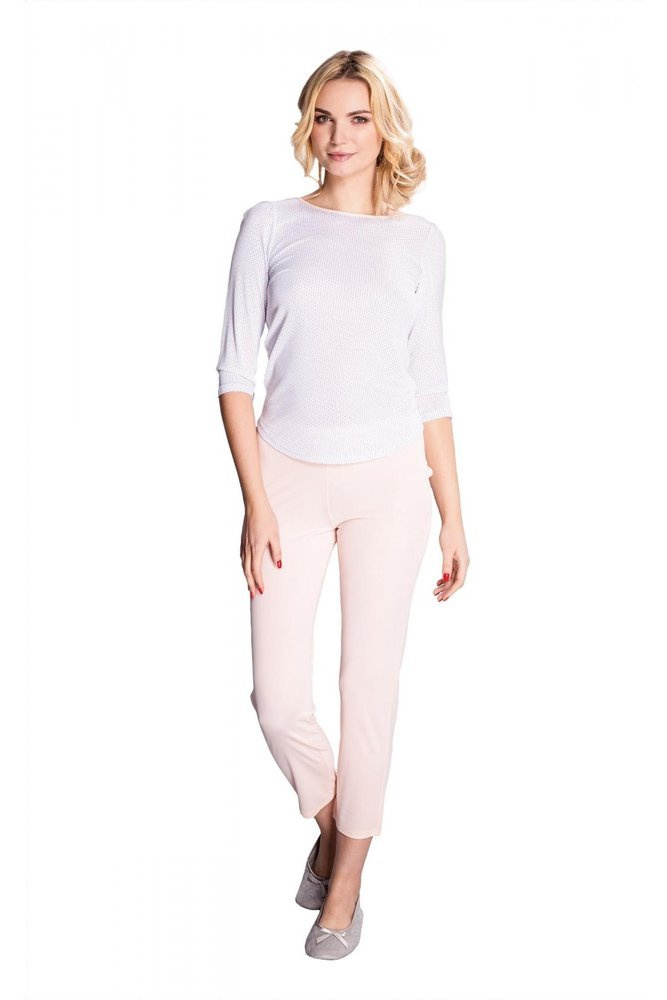 Perila to stonowana, delikatna piżama wykonana z jedwabiu wiskozowego znanego ze swych cudownych właściwości dzięki którym reguluje temperaturę ciała i chroni ją przed przegrzaniem. Perila posiada rękawy o długości 3/4 oraz spodnie do kostek wykończone w pasie delikatna gumką. Góra piżamy pokryta jest nadrukiem w małe, czarne kropki oraz piękny, delikatny haft w kształcie motyli. Spodnie posiadają subtelny łososiowy kolor.