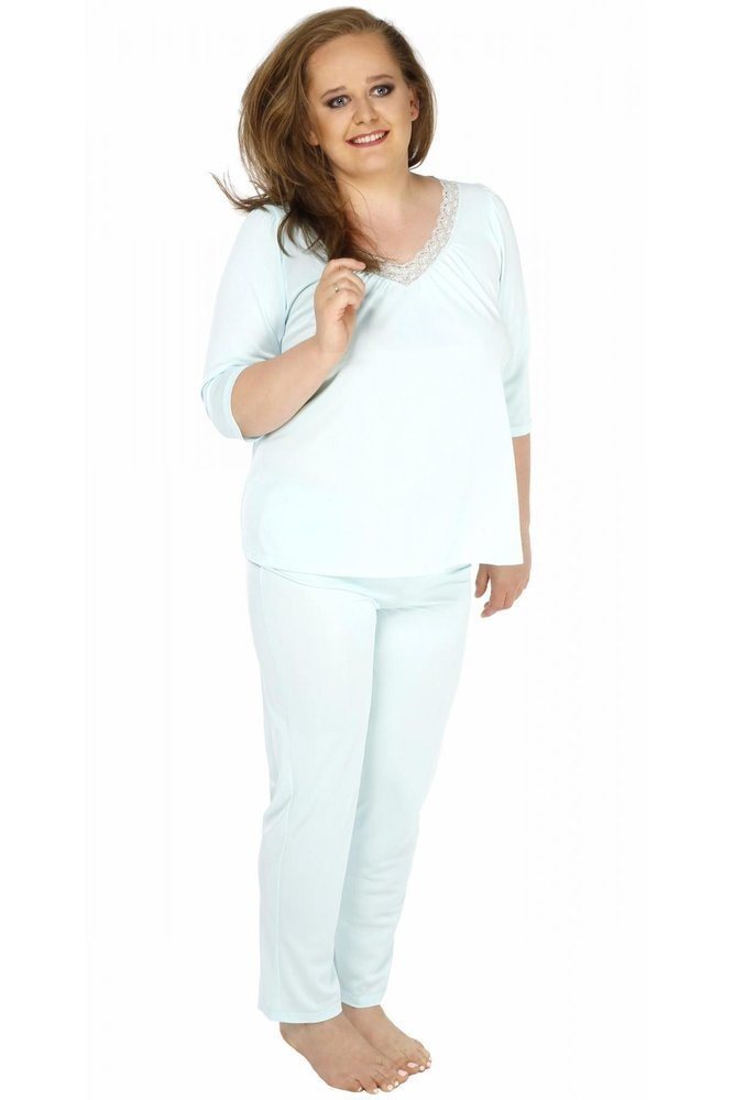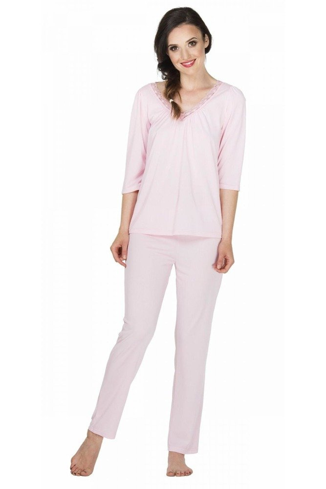 Gustowna piżama ozdobiona delikatną koronką z motywem kwiatowym. Model wykonany z niezwykle miękkiej i przyjemnej dla ciała wiskozy. Góra z rękawem 3/4 i praktycznym dekoltem. Spodnie długie o swobodnym kroju, na wygodnej gumie.
