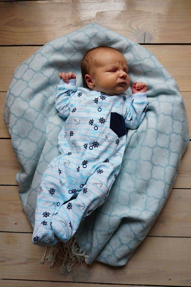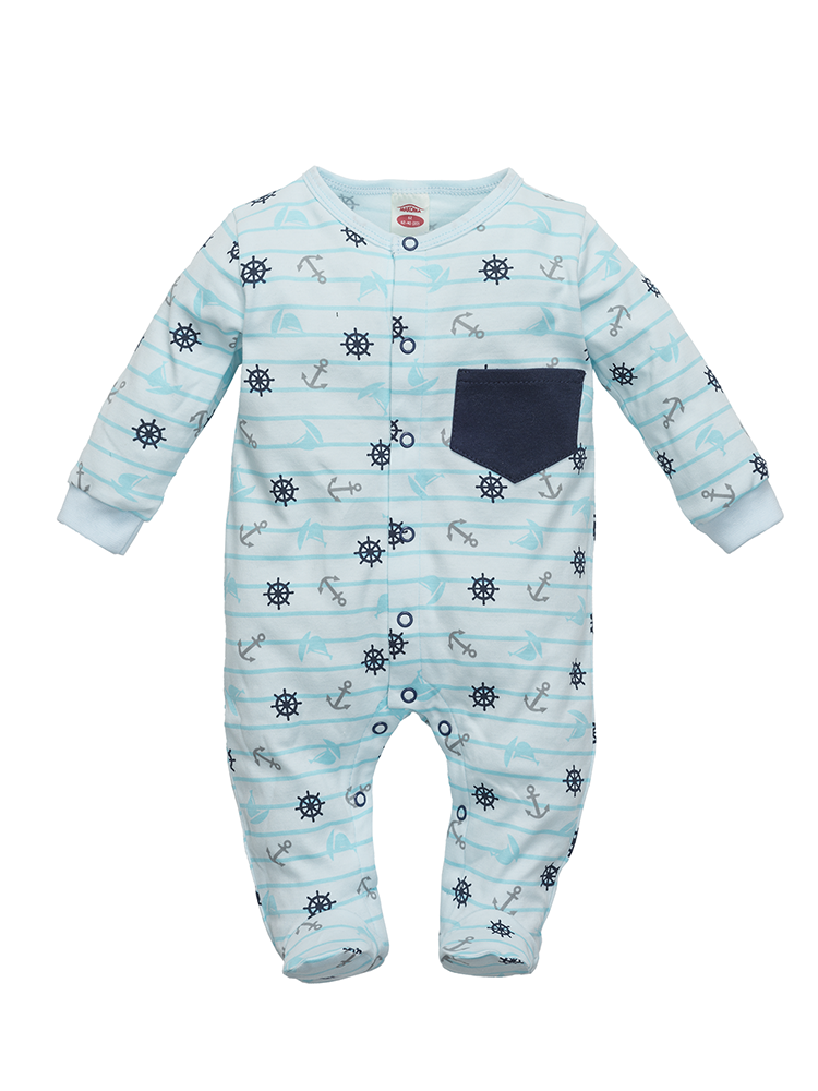 Pajac z motywem kotwicy w odcieniach niebieskiego. Rozpinany na całej długości, co umożliwia łatwe i szybkie ubieranie dziecka. Zapewnia swobodę użytkowania i nie krepuje ruchów dziecka. Dostępny w rozmiarach 56-80. Uszyty z wysokiej jakości materiały bawełnianego.