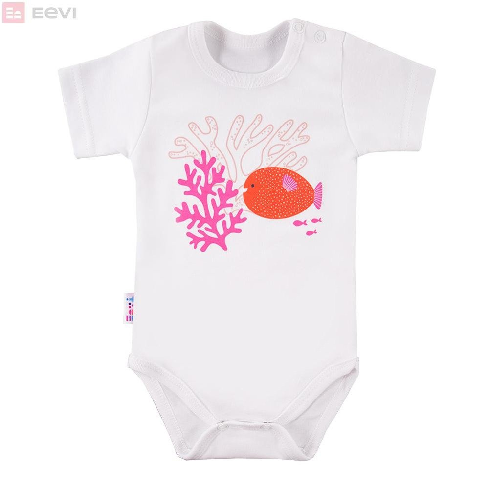 Body dziewczęce z krótkim rękawem z kolekcji "Coral Reef" uszyte z miękkiej i przyjemnej w dotyku dzianiny. Druki wykonane są farbami ekologicznymi. Krój umożliwia rozpięcie, przez co ubranko jest funkcjonalne i wygodne.