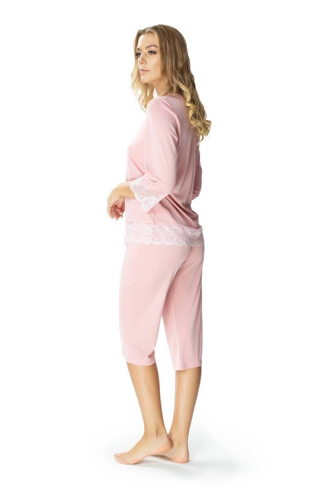 Piżama Peonia to przede wszystkim klasyka i wygoda. Bluzka od piżamy posiada okrągły dekolt oraz rękawki o długości 3/4. Rękawki jak i dół bluzki obszyte romantyczną koronką. Spodnie od piżamy posiadają długość "za kolano" i prosty, klasyczny fason. Idealny model dla Pań plus size.