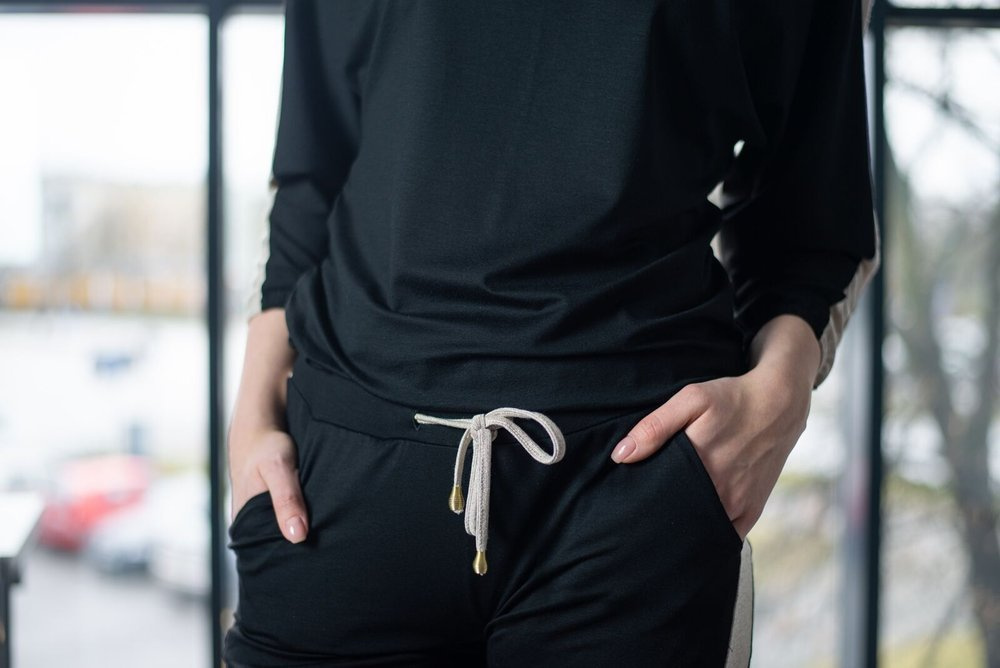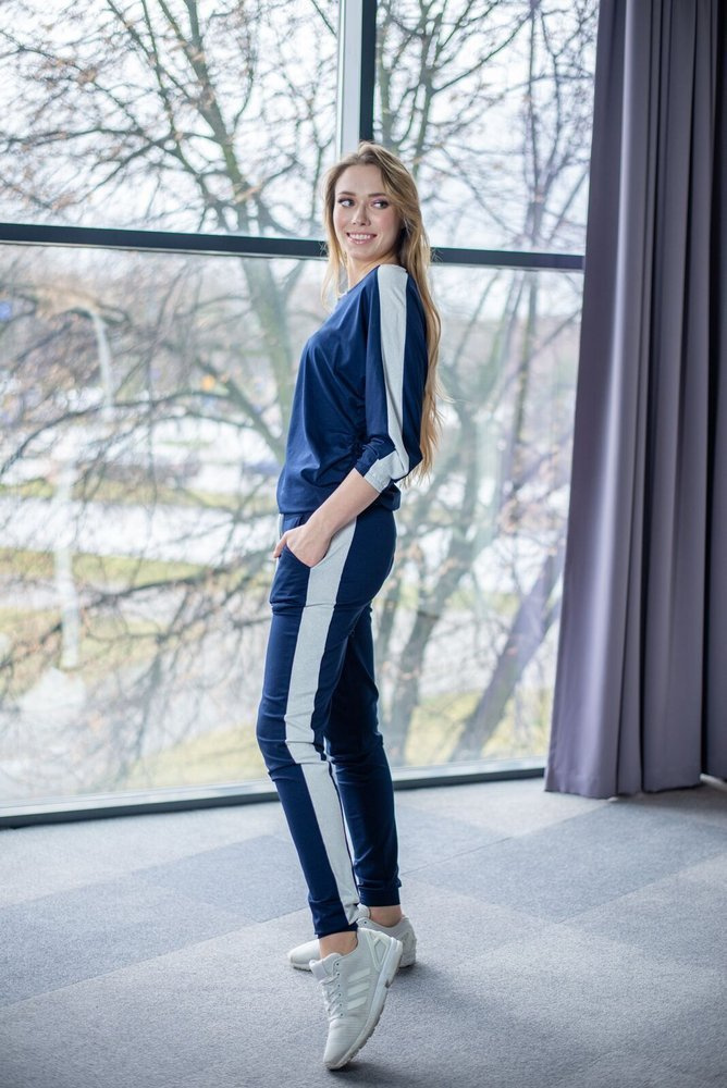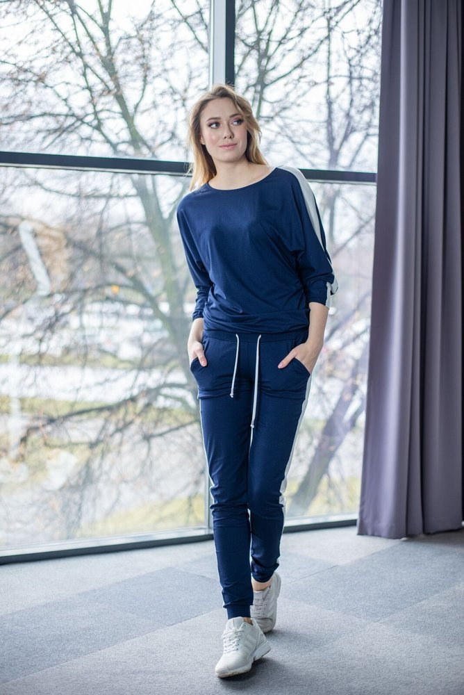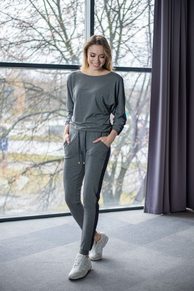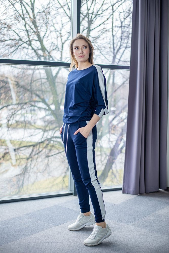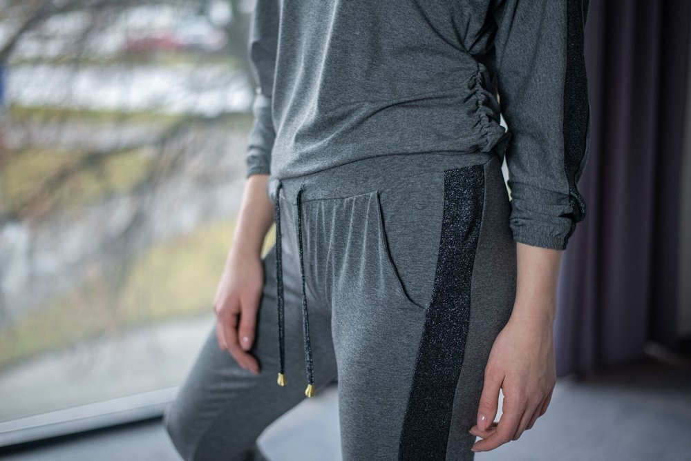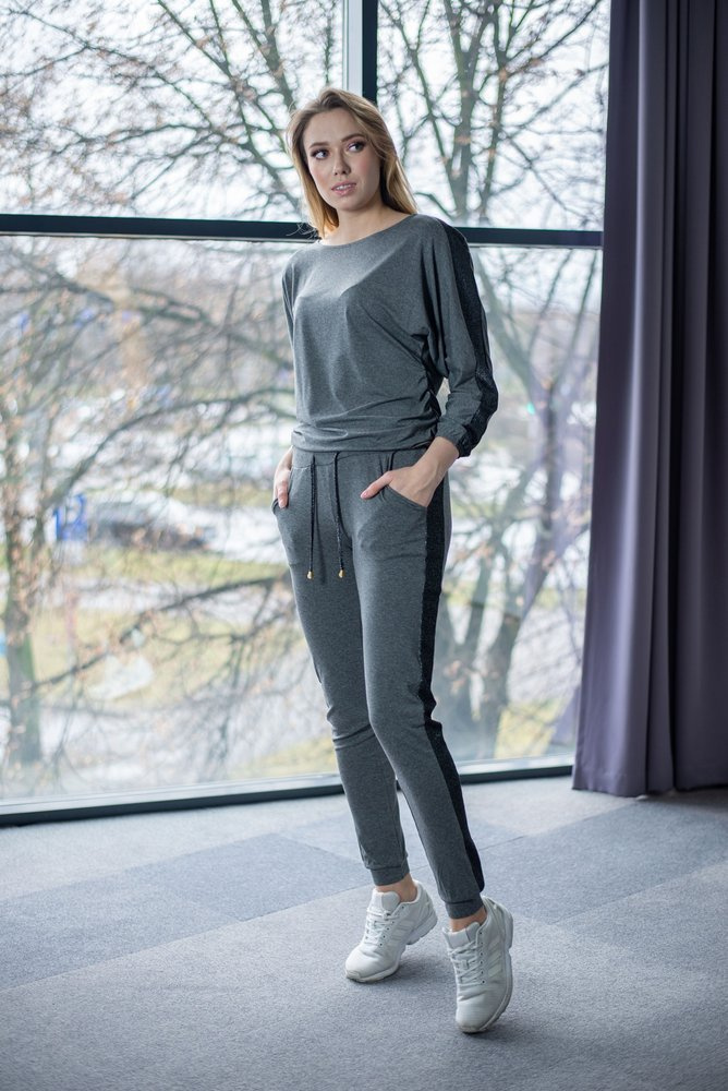 Komplet dresowy wykonany z wysokiej jakości dzianiny. Bluza i spodnie zostały wykończone błyszczącymi lampasami oraz troczkiem co nadaje niecodzienny charakter pozornie zwykłemu dresowi. Marszczenie na boku bluzy pozwoli użytkować komplet w trakcie ciąży ponieważ pomieści ona ciążowy brzuszek.Chcesz poczuć się modnie i stylowo? Jest to komplet dla Ciebie.