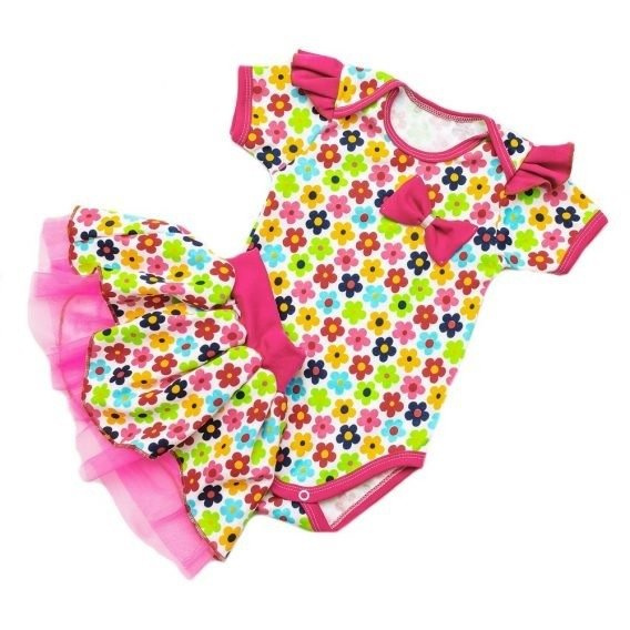 Komplet składa się body z krótkim rękawkiem z falbankami oraz spódniczki tiulowej.