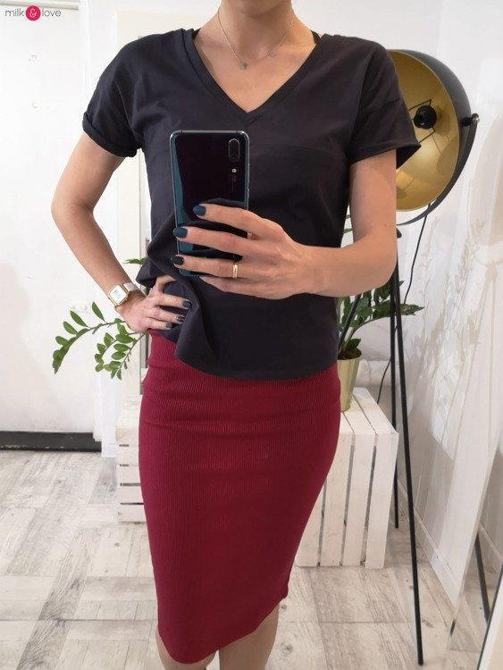 Spódnica ciążowa to idealna baza do ciążowych stylizacji. Można ją nosić na co dzień z trampkami, z balerinami na niezobowiązujące spotkania i do szpilek na większe wyjścia. Miękka dzianina nie powoduje ucisku oraz daje swobodę ruchu. Niski pas typu "jodełka" jest niezwykle wygodny, bo nie podrażnia skóry na brzuchu, która staje się szczególnie wrażliwa w ciąży. To najlepsze rozwiązanie na cieplejsze, wiosenno-letnie dni.