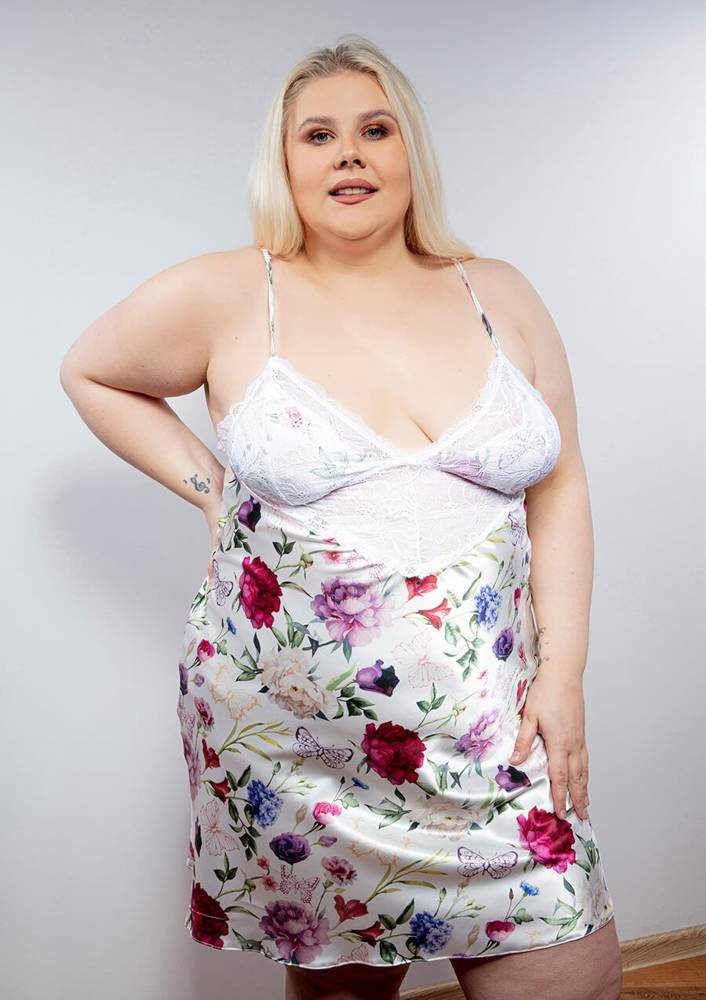 Zwiewny dotyk satyny utuli Cię do snu. Haleczka wykonana z drukowanej satyny natomiast góra koszulki wykończona efektowną koronką .