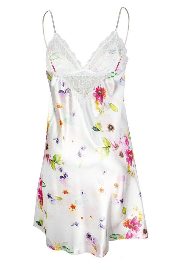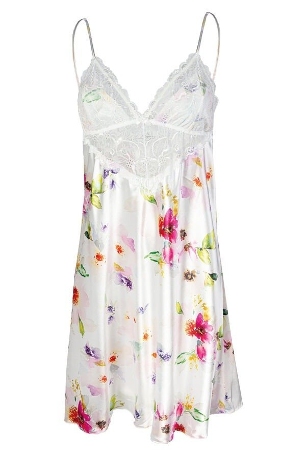 Zwiewny dotyk satyny utuli Cię do snu. Haleczka wykonana z drukowanej satyny natomiast góra koszulki wykończona efektowną koronką .