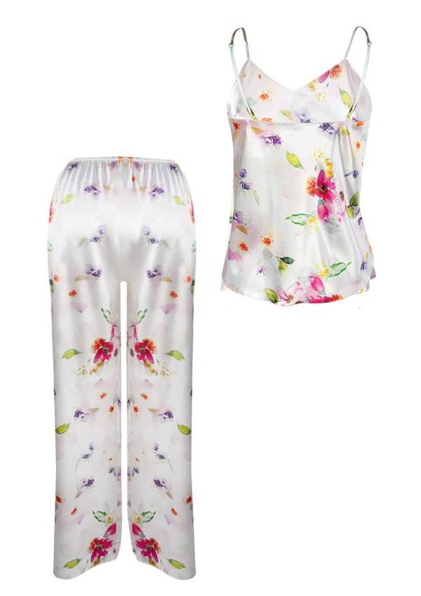 Prosty, zmysłowy dwuczęściowy komplet składający się z koszulki oraz długich spodni. Odważny dekolt w kształcie litery „V”, który jest niezwykle kuszący. Góra koszulki wykonana z drukowanej wzorzystej satyny. Wąskie ramiączka z regulacją zapewnią Tobie poczucie komfortu podczas snu. Spodnie proste, długie satynowe na cienkiej gumce dodające elegancji.