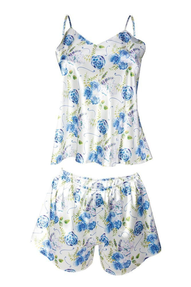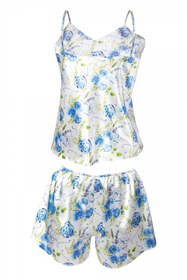 Efektowna piżama damska wykonana z delikatnej, przyjemnej dla ciała satyny. Koszulka z głębokim dekoltem na wąskich regulowanych ramiączkach. Do kompletu krótkie spodenki, o luźnym kroju.