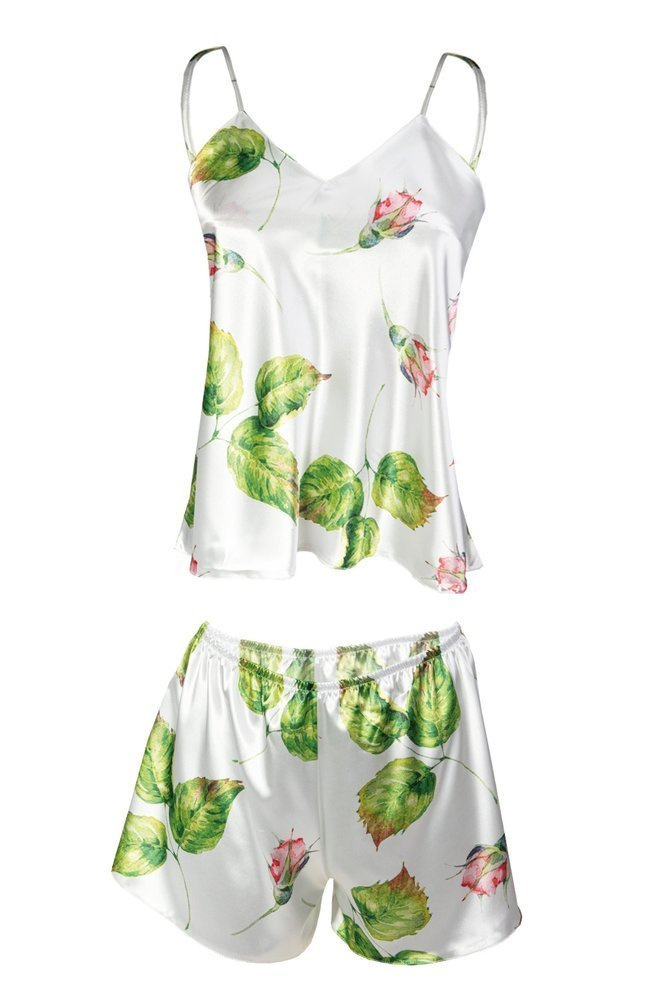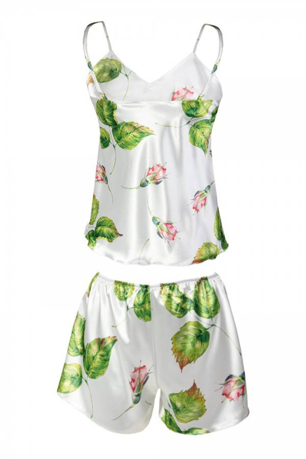 Efektowna piżama damska wykonana z delikatnej, przyjemnej dla ciała satyny. Koszulka z głębokim dekoltem na wąskich regulowanych ramiączkach. Do kompletu krótkie spodenki, o luźnym kroju.