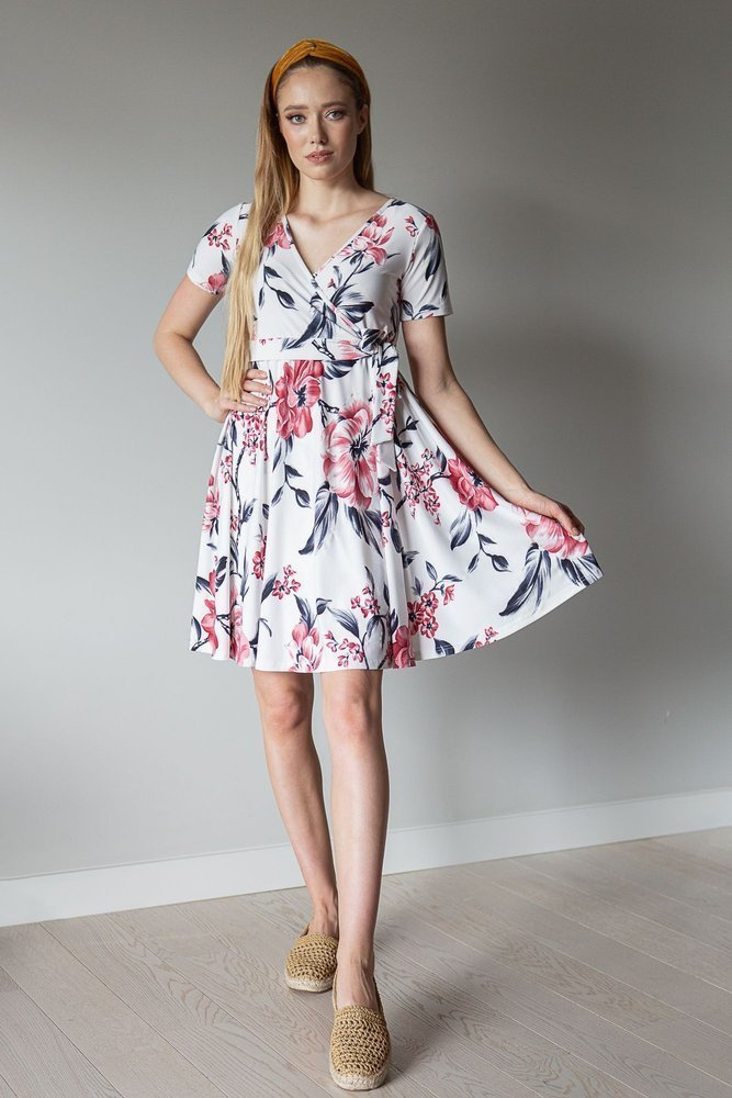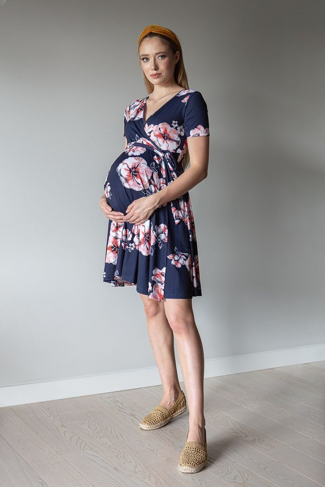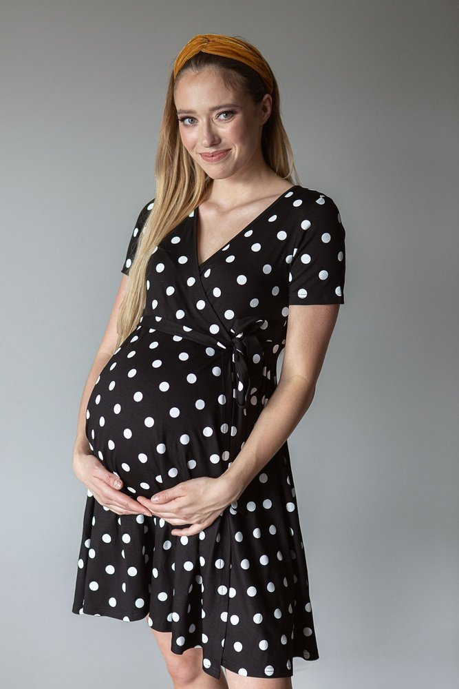 Zwiewna letnia sukienka z krótkim rękawem idealna dla kobiety w ciąży , karmiących piersią jak i kobiety które ciąże mają już za sobą . „Kopertowy” krój z wiązaniem na boku sprawia że sukienka świetnie się układa na ciążowym brzuchu, nie krępuje ruchów i nie opina się. Krój sukienki przystosowany jest do wygodnego karmienia piersią.