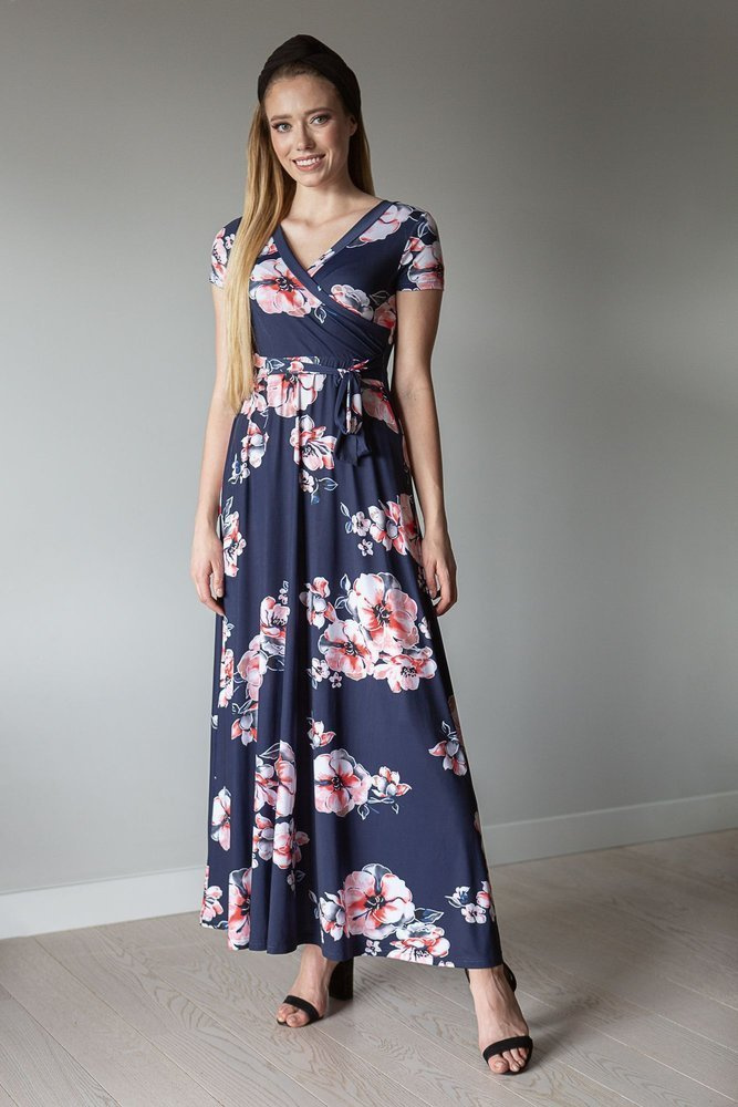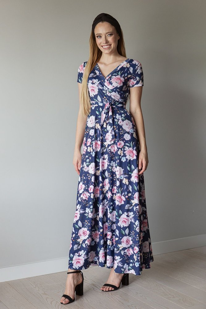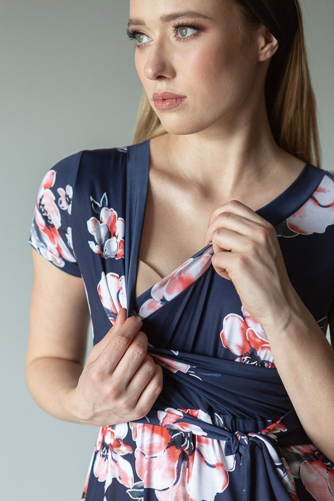 123 Wizytowa Sukienka krótki rękaw MIRACLE- granatowa duże kwiaty-