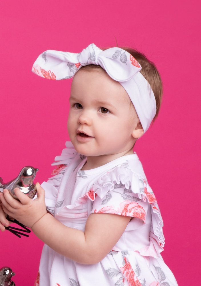 Delikatna, dziewczęca opaska w styli PIN UP. Wykonana z miękkiej bawełny. Będzie doskonałym uzupełnieniem stylizacji. Opaska jest w kolorze ecru, ozdobiona wzorem w kwiaty. Doskonale komponuje się z pozostałymi ubrankami z kolekcji Róża.