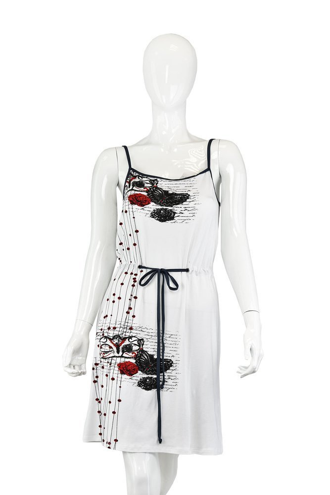 Koszula damska ozdobiona kolorowym wzorem, z wysokiej jakości wiskozy. Wąskie, regulowane ramiączka. Na wysokości tali sznureczek do regulacji obwodu.