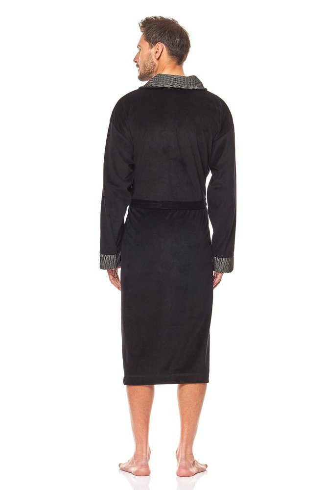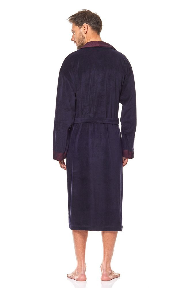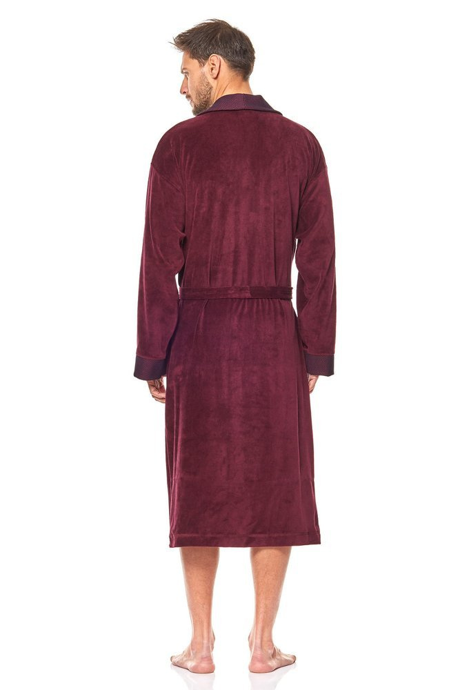 Welurowy szlafrok męski, długi z szalowym kołnierzem, wiązany w pasie.