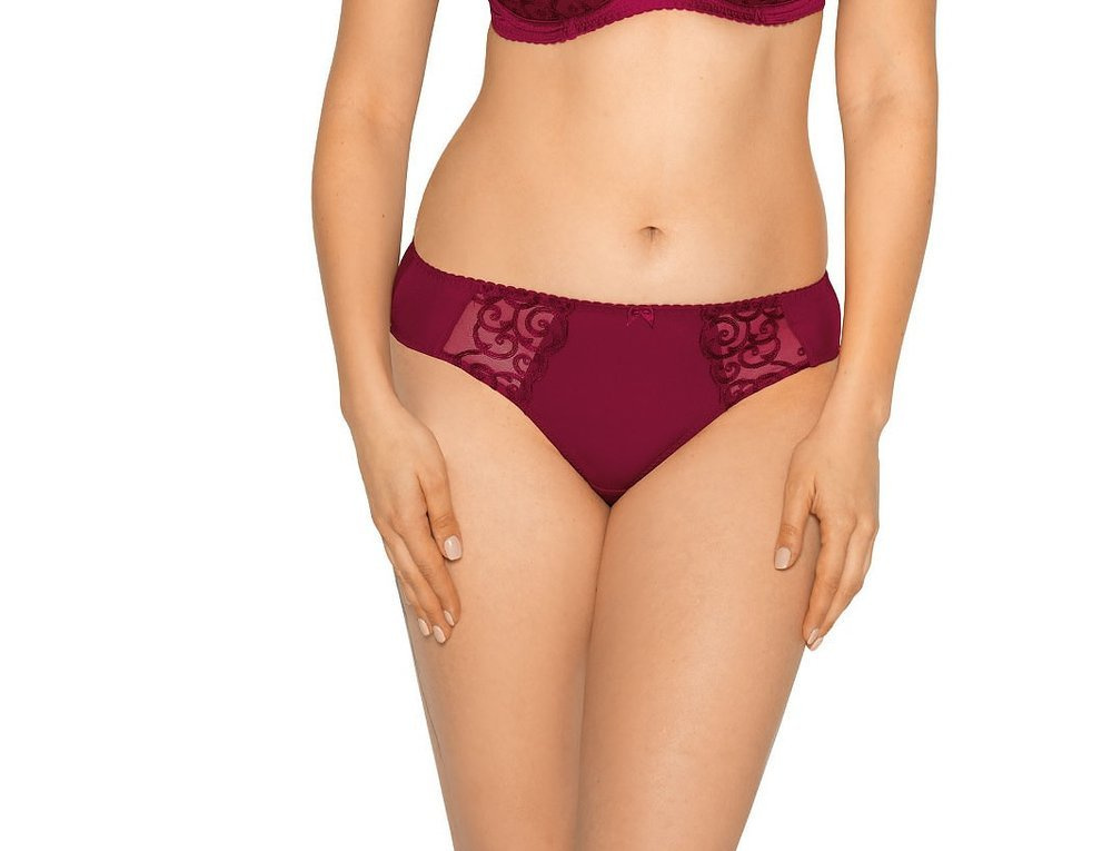 Figi damskie wykonane z gładkiej mikrofibry, po bokach delikatne tiulowe wstawki ozdobione haftem, tył gładki.