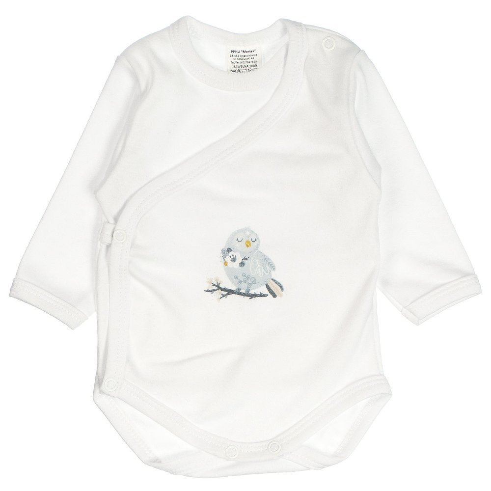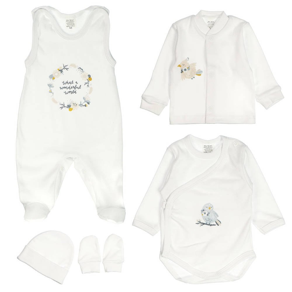 Zestaw niemowlęcy, który składa się z bodów kopertowych, bardzo praktycznych dla noworodka, kaftanika, śpioszków,czapeczki i łapek. Nadruk wykonano bezpieczną metodą farb wodnych. Zatrzaski wykonano z antyalergicznego, bezniklowego tworzywa.