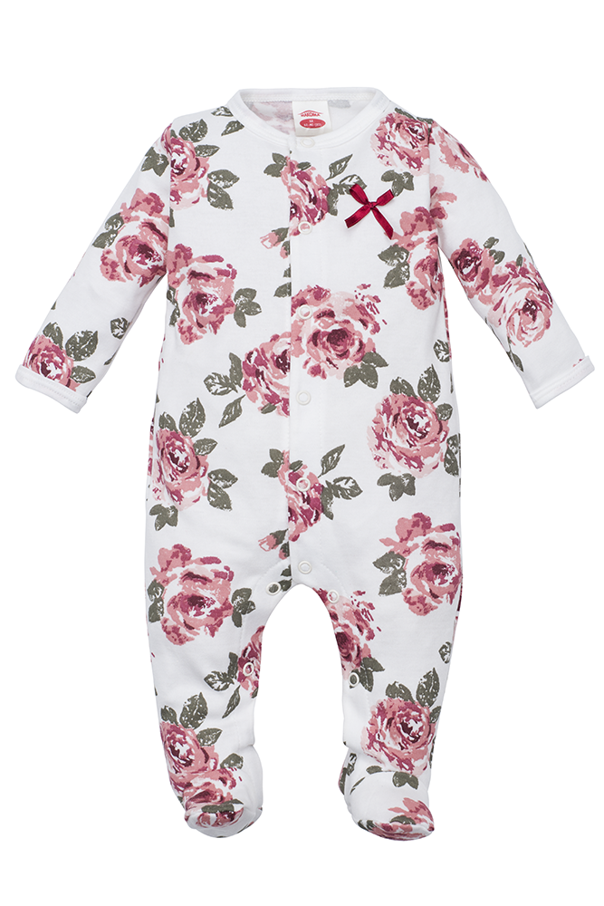 Pajac z motywem różyczek w odcieniach bieli. Rozpinany na całej długości, co umożliwia łatwe i szybkie ubieranie dziecka. Zapewnia swobodę użytkowania i nie krepuje ruchów dziecka. Dostępny w rozmiarach 56-86. Uszyty z wysokiej jakości materiały bawełnianego.