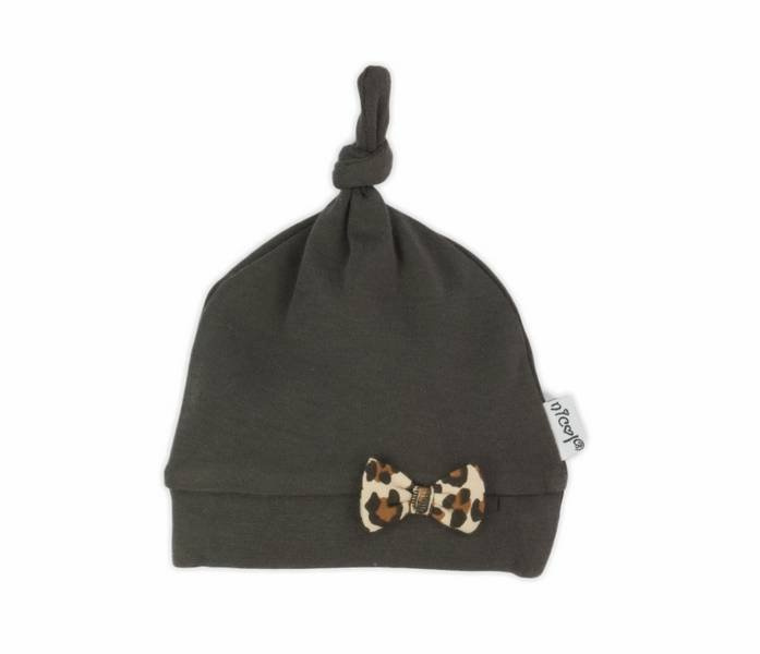 Modna czapka w kolorze brązowym z dodatkiem panterki. Materiał jest całkowicie bezpieczny dla dziecka. Dopełnienie kolekcji "Mia".