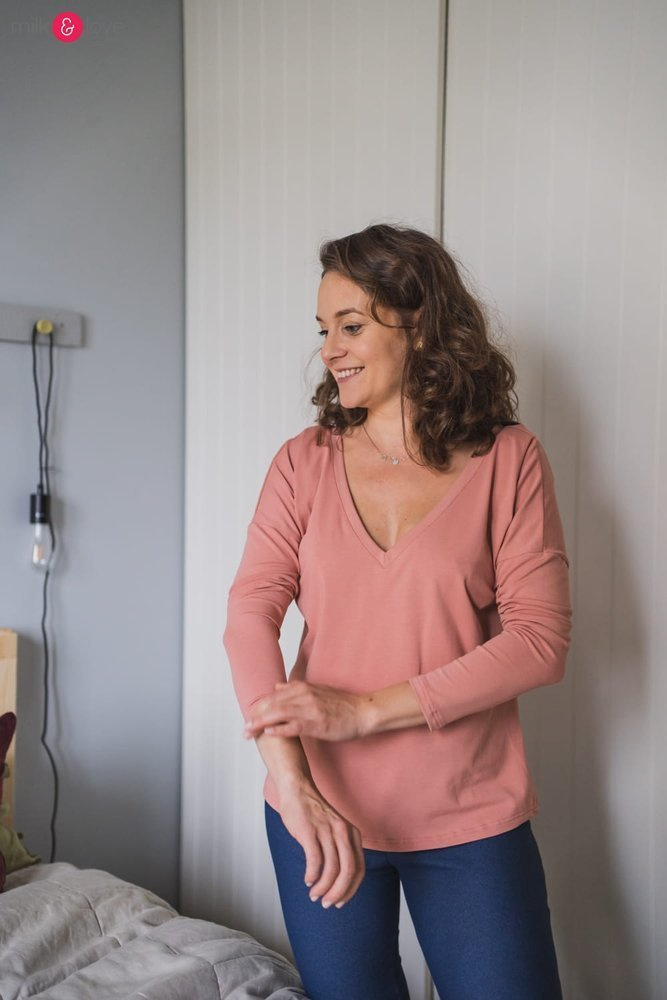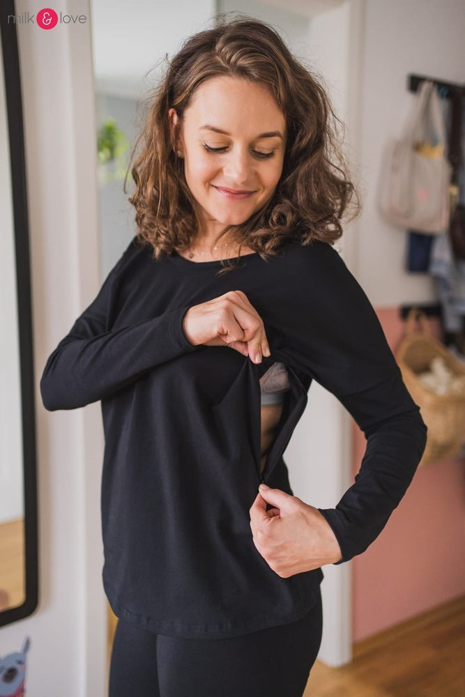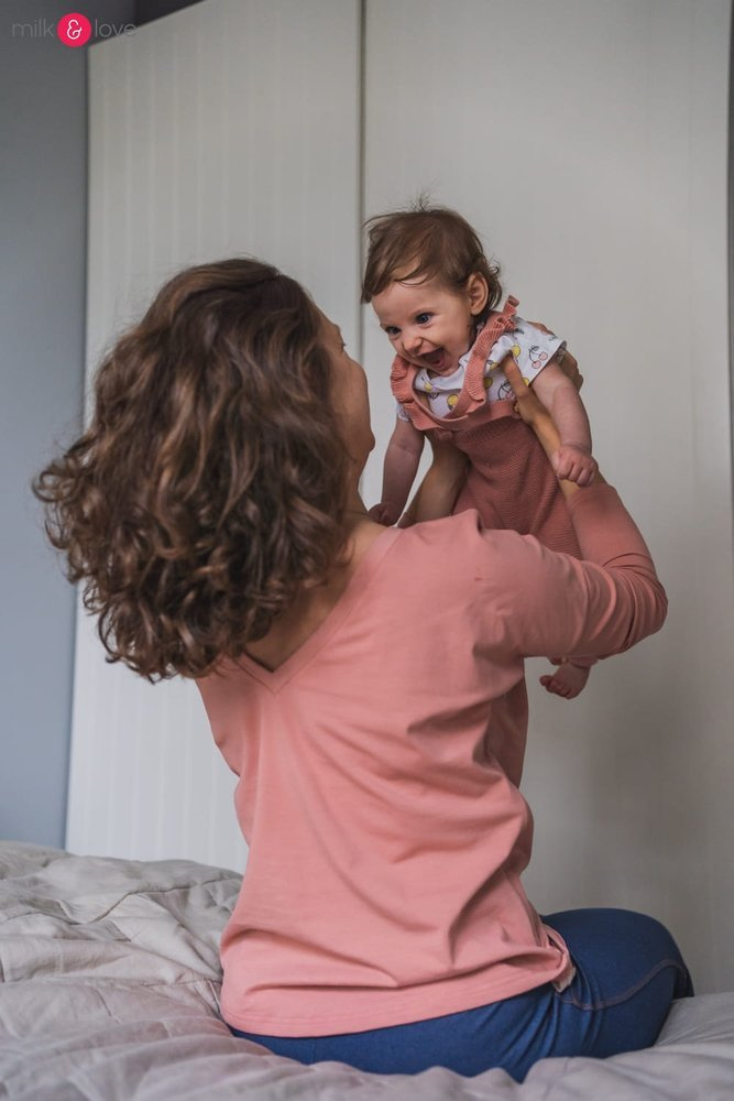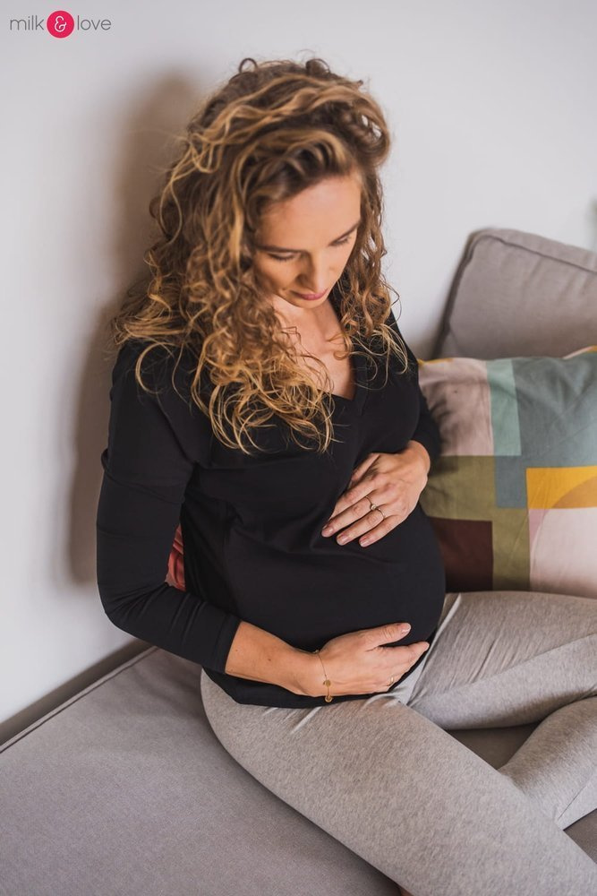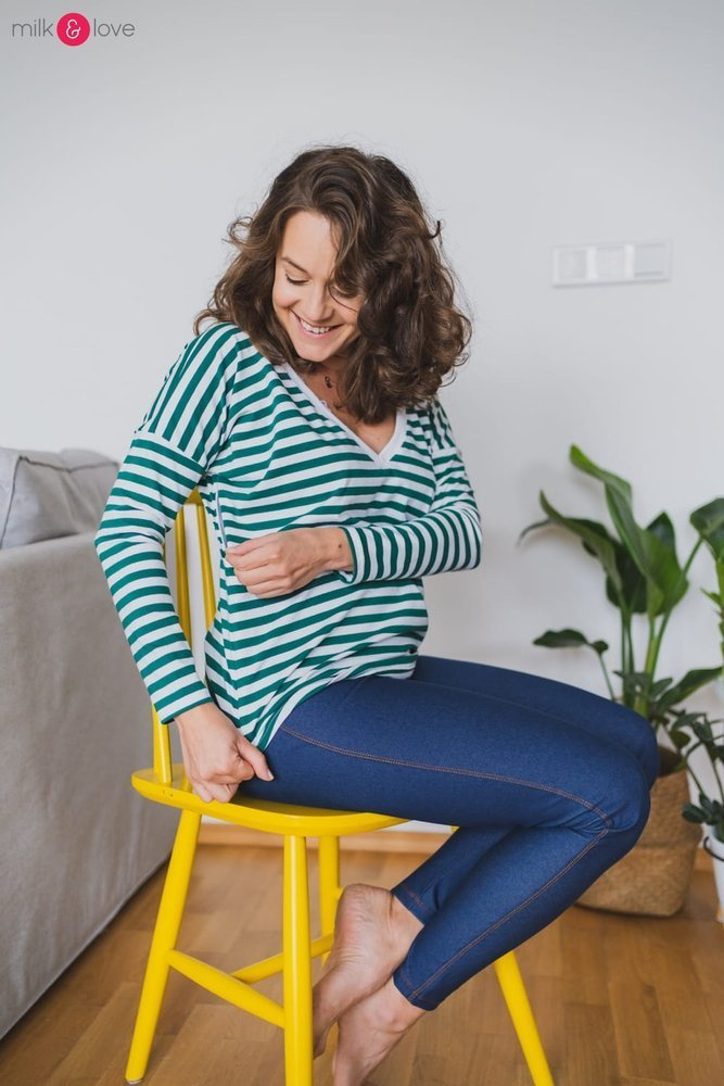 Bluzki ciążowe i do karmienia Two Ways są uszyte z elastycznej dzianiny bawełnianej, która ładnie dopasowuje się do zmieniających się kształtów ciała w i po ciąży. Wysokiej jakości włókna wiskozowe nie odkształcają się, dzięki czemu bluzka nie traci fasonu i po porodzie dalej służy jako bluzka do karmienia. Ukryte otwarcie z lekko osłaniającymi pierś zakładkami umożliwia komfortowe i dyskretnie karmienie piersią. Model bluzki 2w1 - którą możesz nosić dekoltem V-neck do przodu lub na plecach tworząc zupełnie różne stylizacje!