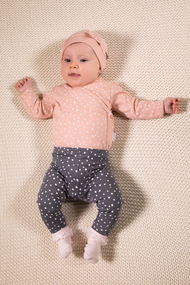 Nie krępujące ruchów, wygodne spodnie w kropki, uszyte z bawełny wysokiej jakości, posiadającej certyfikat Oeko-Tex Standard 100 Tekstylia godne zaufania. Nogawki i pas zakończone zostały elastycznymi, bezuciskowymi ściągaczami pod kolor.