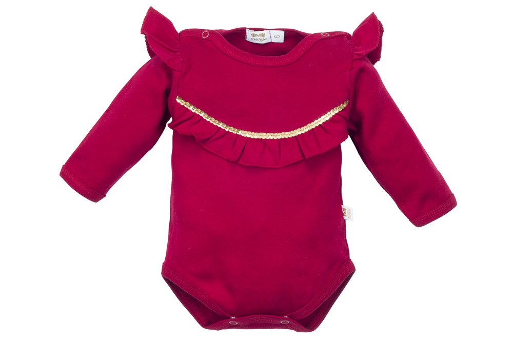 Piękne body z kolekcji CHERRY, ozdobione falbankami na rękawkach oraz przodzie. W modnym w tym sezonie kolorze - czerwony. Body idealnie pasuje jako uzupełnienie, każdej stylizacji małej dziewczynki: do spódniczki, spodenek lub bloomersów. Wykonane z mięciutkiej bawełny.