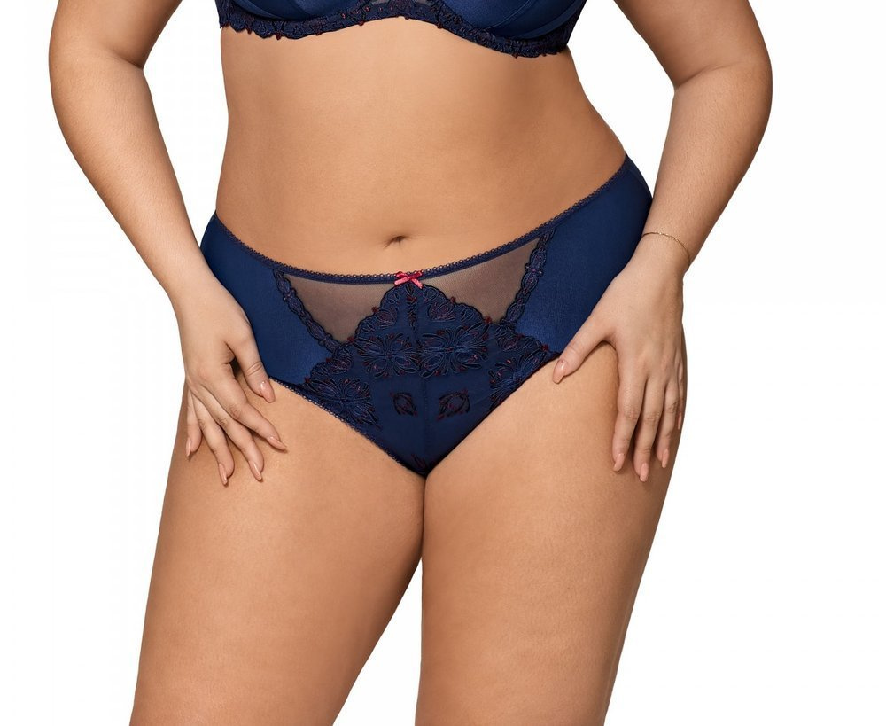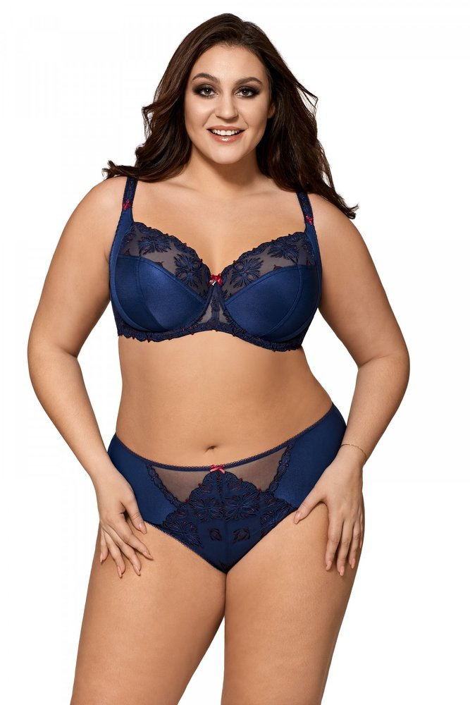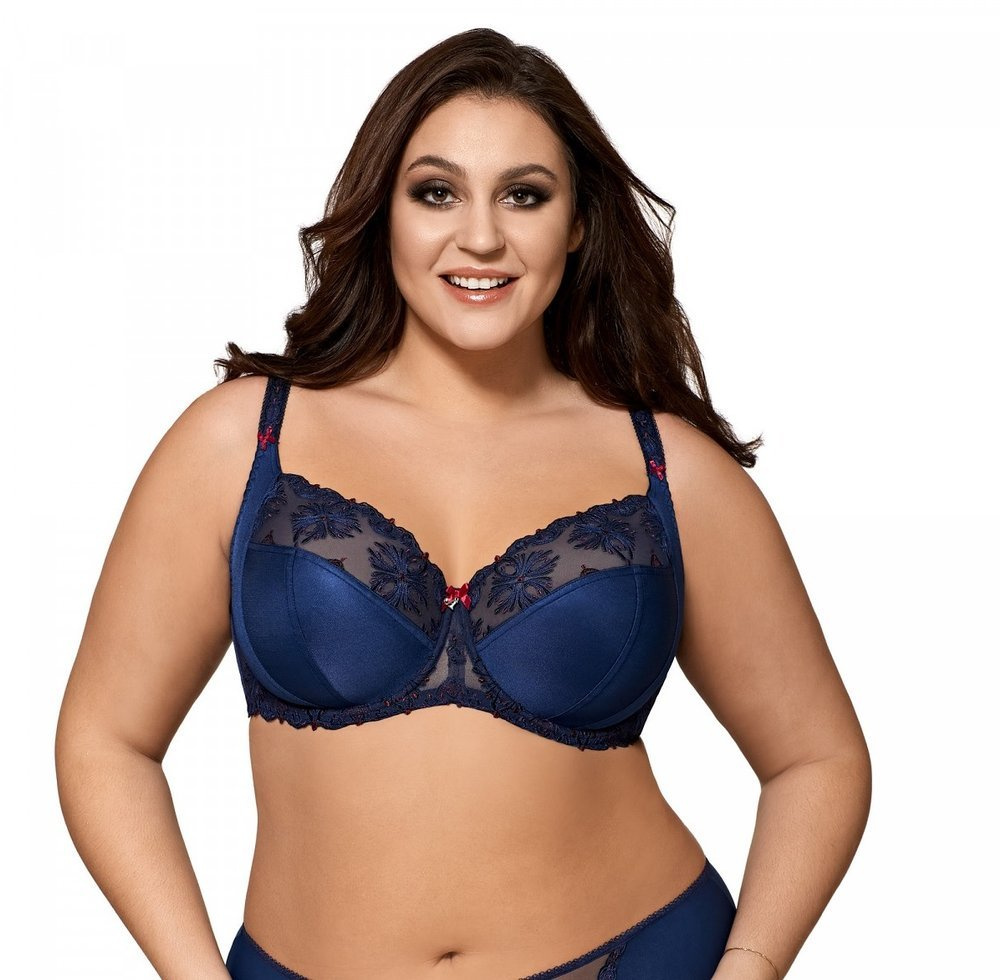 Zmysłowy biustonosz miękki z fiszbinami. Miseczki wykonane  z połyskującej, gładkiej dzianiny. Górna linia miseczek z siateczki ozdobionej efektownym haftem.  Boczki wzmocnione pionowymi fiszbinami. Ramiączka regulowane, nieodpinane, różnej szerokości w zależności od rozmiaru