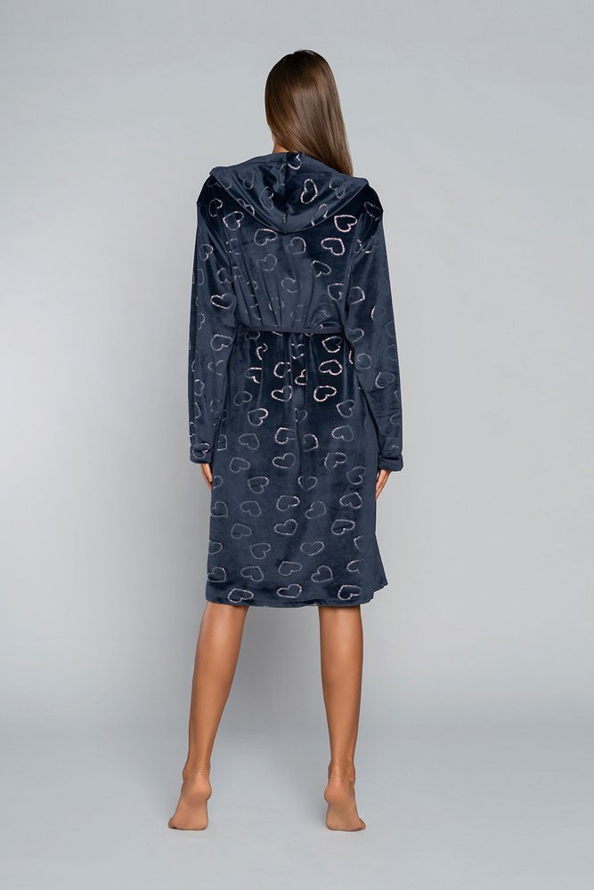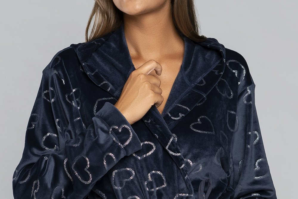 Szlafrok damski Eliksir spełni wszystkie te oczekiwania. Już sam dotyk powoduje, że zapragniesz zatopić się w nim. Wykonany z niezwykle miękkiej i delikatnej dzianiny Bi polar, w klasycznym głębokim, odcieniu granatu i pięknej soczystej czerwieni, ozdobiony srebrnymi, błyszczącymi sercami.