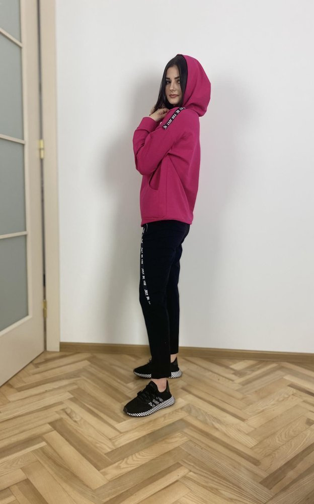 Wygodny dres damski z przyjemnego dla ciała materiału. Bluza z długim rękawem i kapturem. Na wysokości brzucha kieszeń. Spodnie z kieszeniami. Pas zakończony ściągaczem. Rękawy i nogawki obszyte lamówką z napisami.