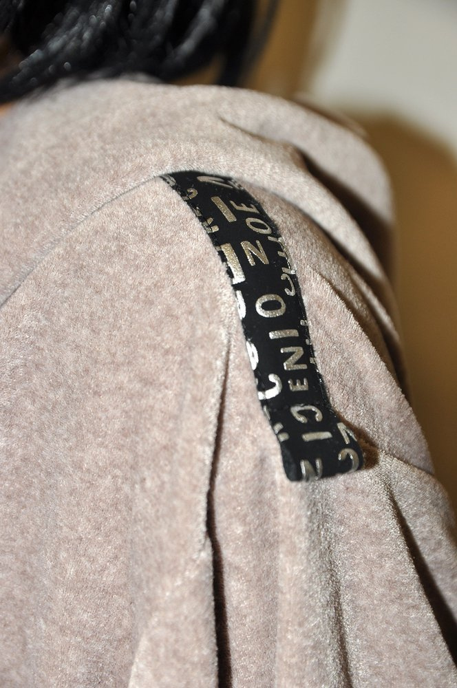 Krótki szlafrok damski z kapturem, z melanżowego weluru. Na wysokości bioder wygodne kieszenie, z tyłu, w linii talii gumka. Pasek wszyty na stałe. Ramiona i pasek z czarnym lampasem z połyskującymi napisami. Szlafrok świetnie dopasowuje się do kształtu ciała, jest niezwykle miękki i lekki. Otulenie się nim po kąpieli to sama przyjemność!