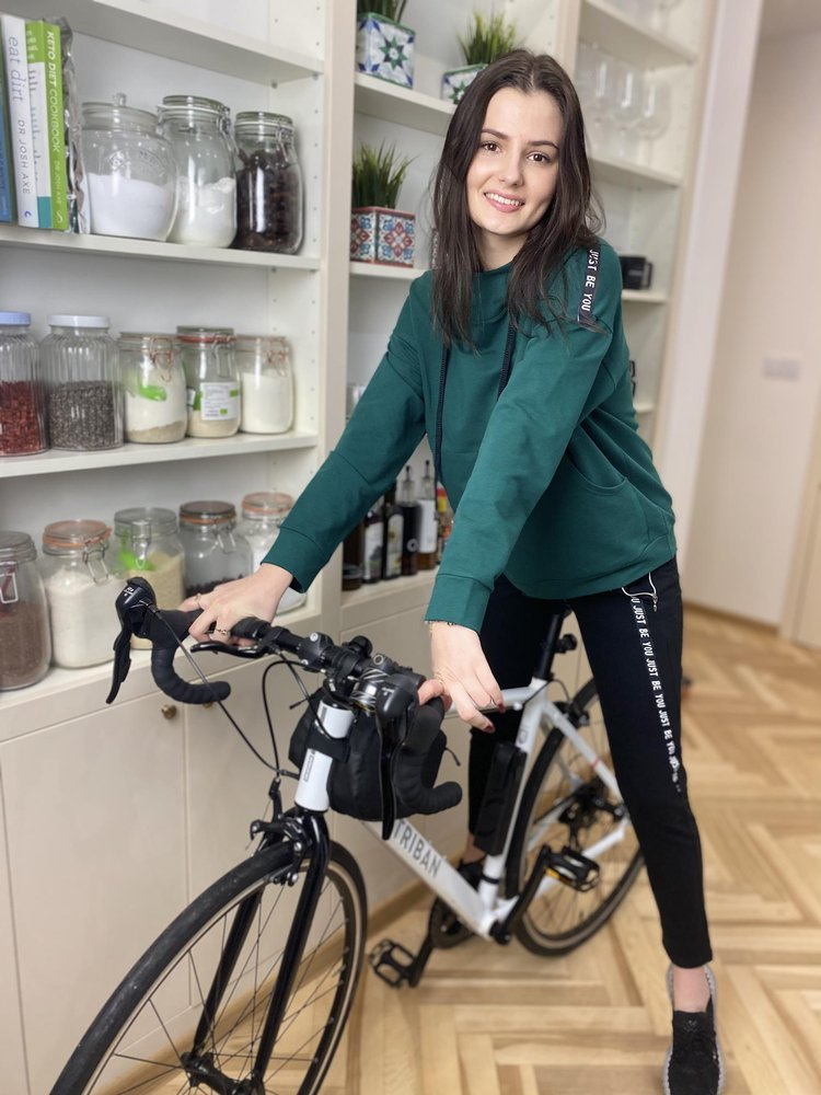 Wygodny dres damski z przyjemnego dla ciała materiału. Bluza z długim rękawem i kapturem. Na wysokości brzucha kieszeń. Spodnie z kieszeniami. Pas zakończony ściągaczem. Rękawy i nogawki obszyte lamówką z napisami.